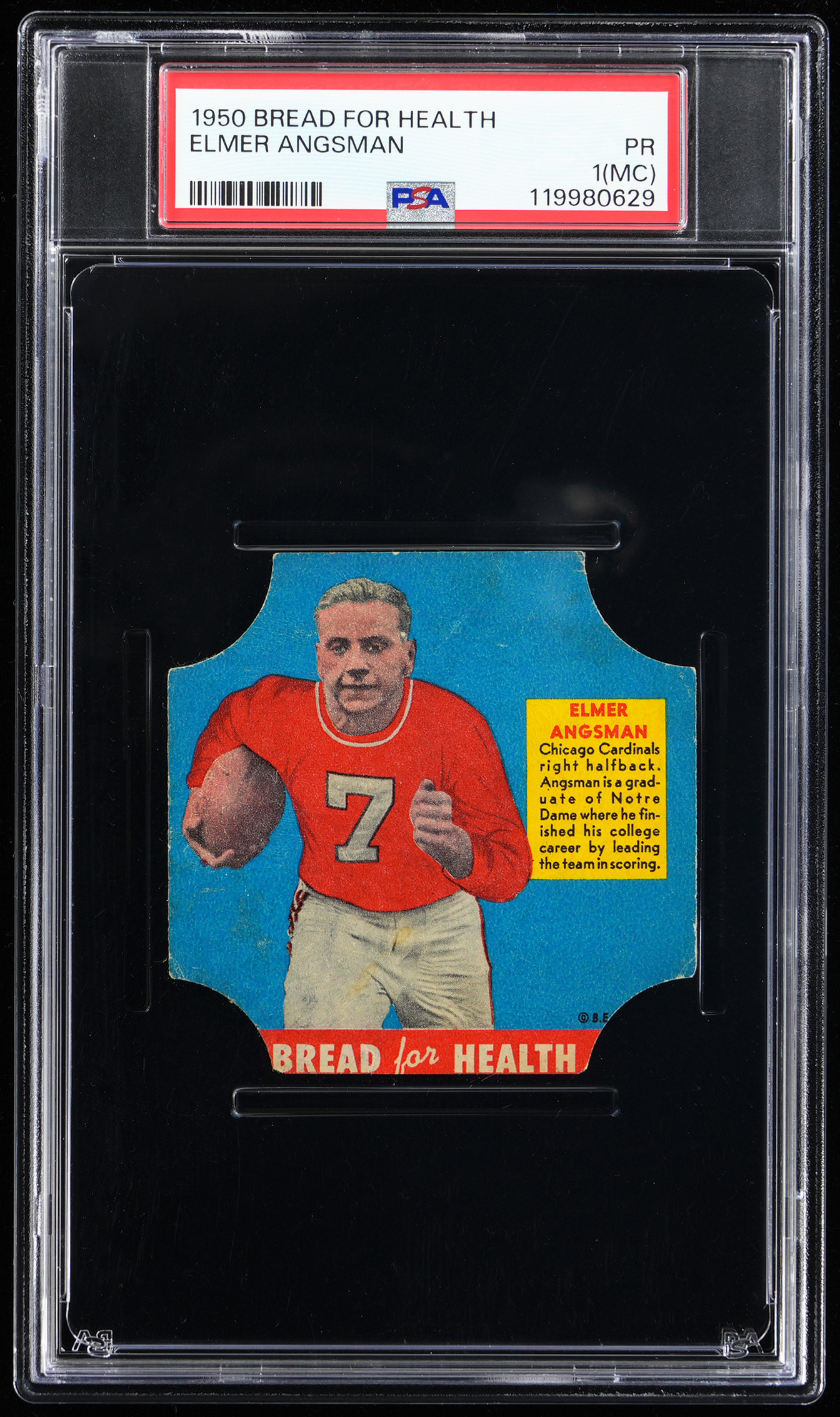 Graded POOR 1 by PSA with an (mc) qualifier. Chicago Cardinals halfback Elmer Angsman. Total population: 3. Part of a 1950 Bread for Health Football bread label near set break. Each non-Hall of Famer has a total census of 5 or lesser with the majority being the highest graded.