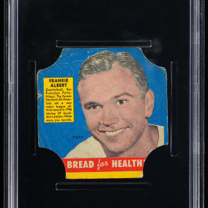Graded POOR 1 by PSA. San Francisco 49ers star quarterback and College Football Hall of Famer Frankie Albert. Total population: 4. Part of a 1950 Bread for Health Football bread label near set break. Each non-Hall of Famer has a total census of 5 or lesser with the majority being the highest graded.