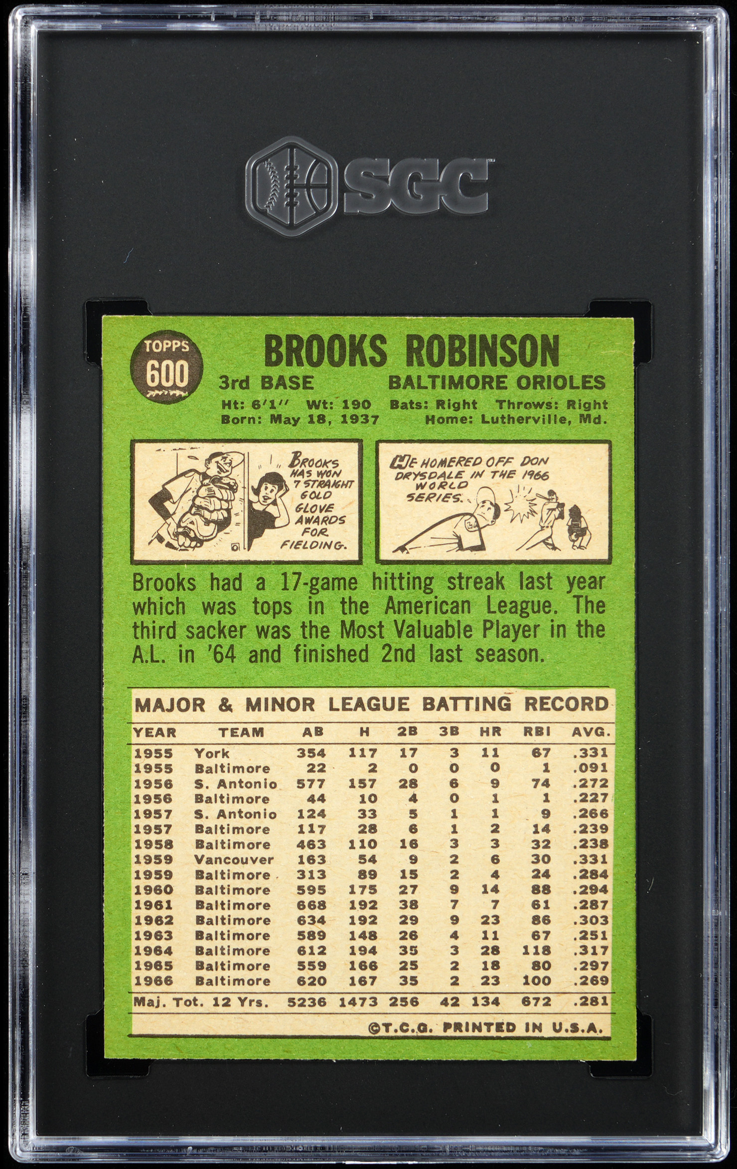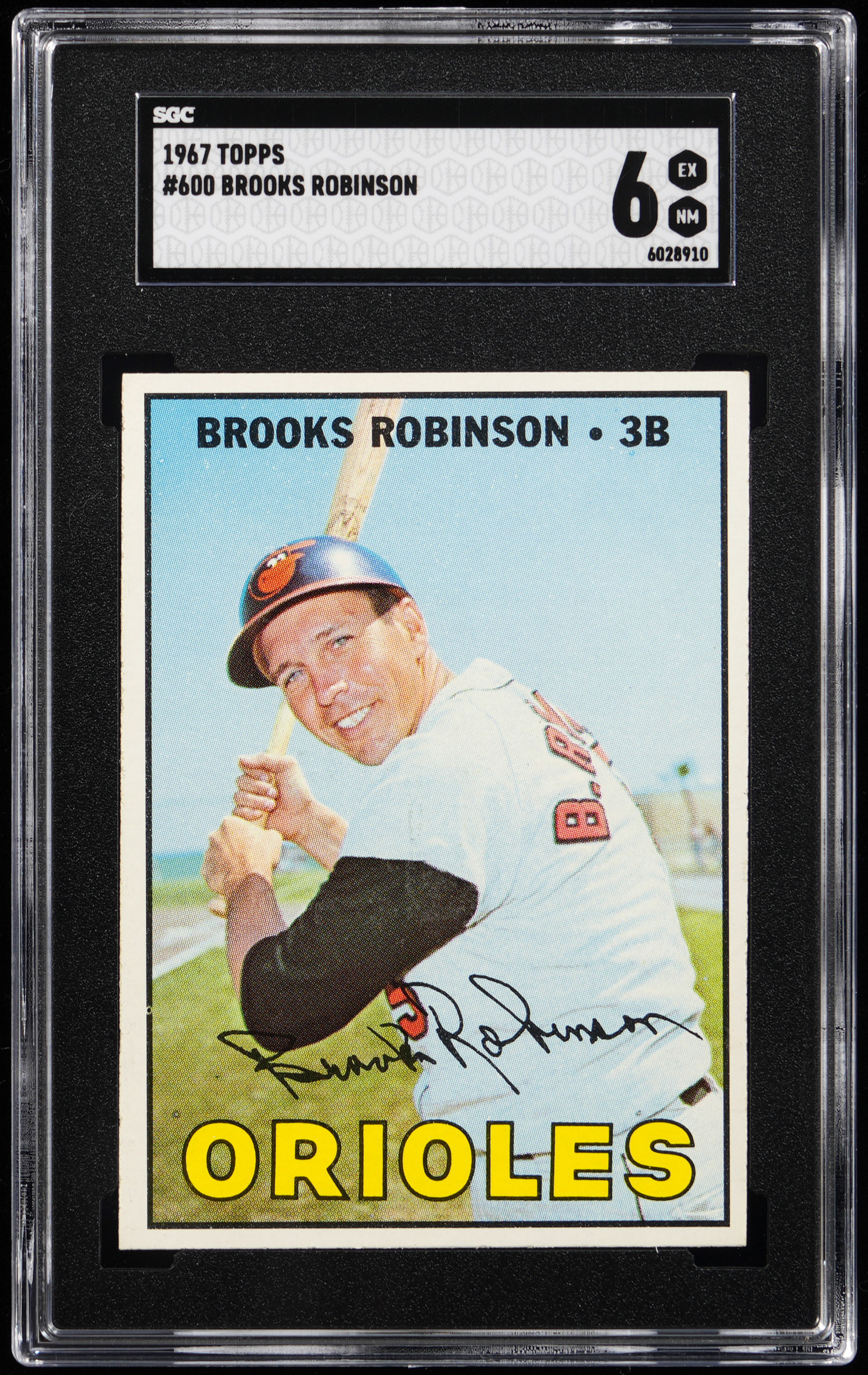 Graded EX/NM 6 by SGC. There was a time when the offered 1967 Topps #600 Brooks Robinson high number was valued higher than his rookie card! While not the case today, this tough Brooks is still a vital piece to any complete/team set gathering. Baltimore Orioles Hall of Famer.