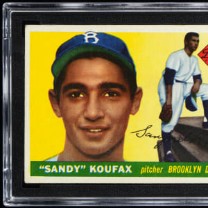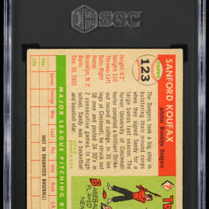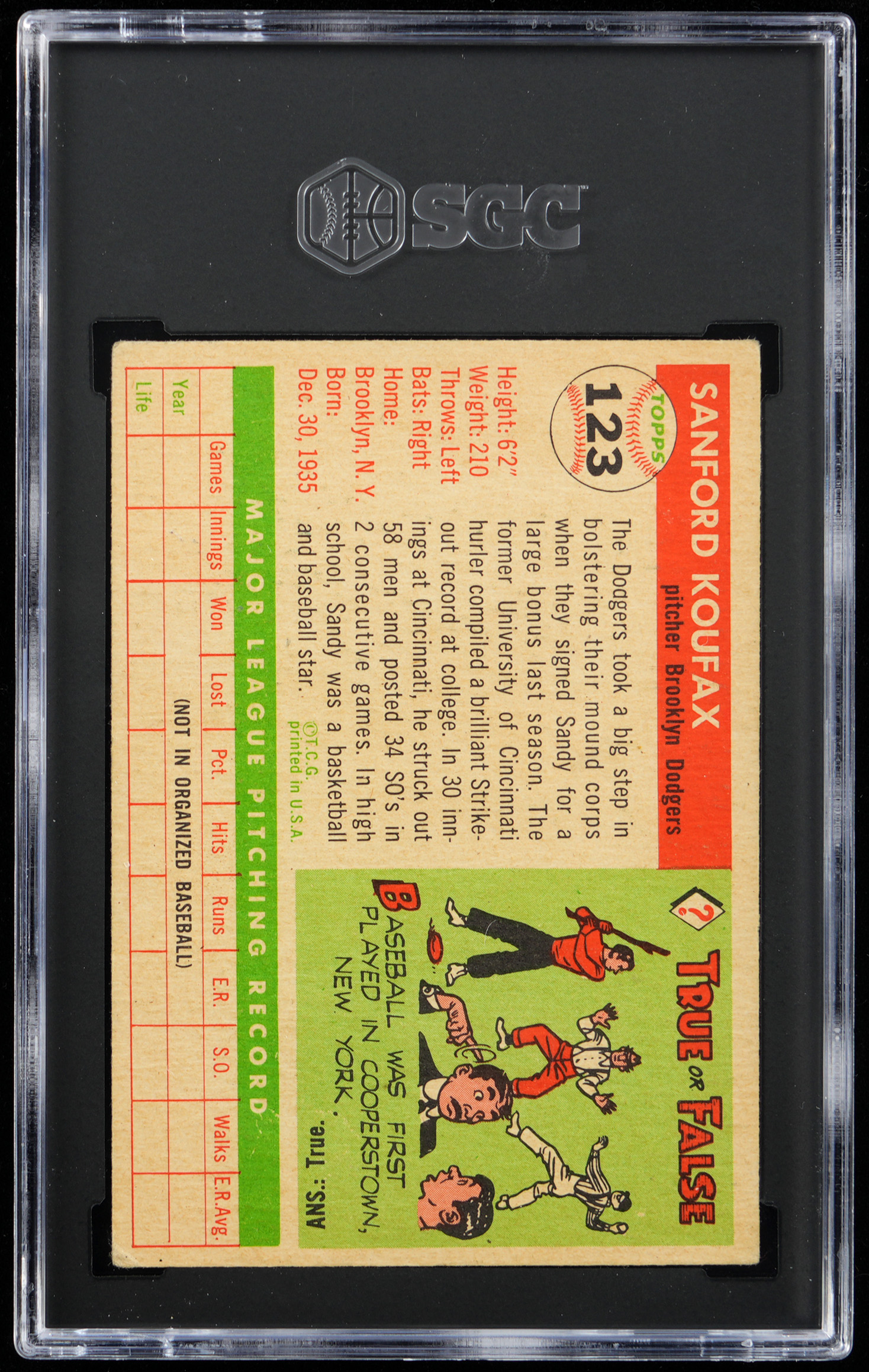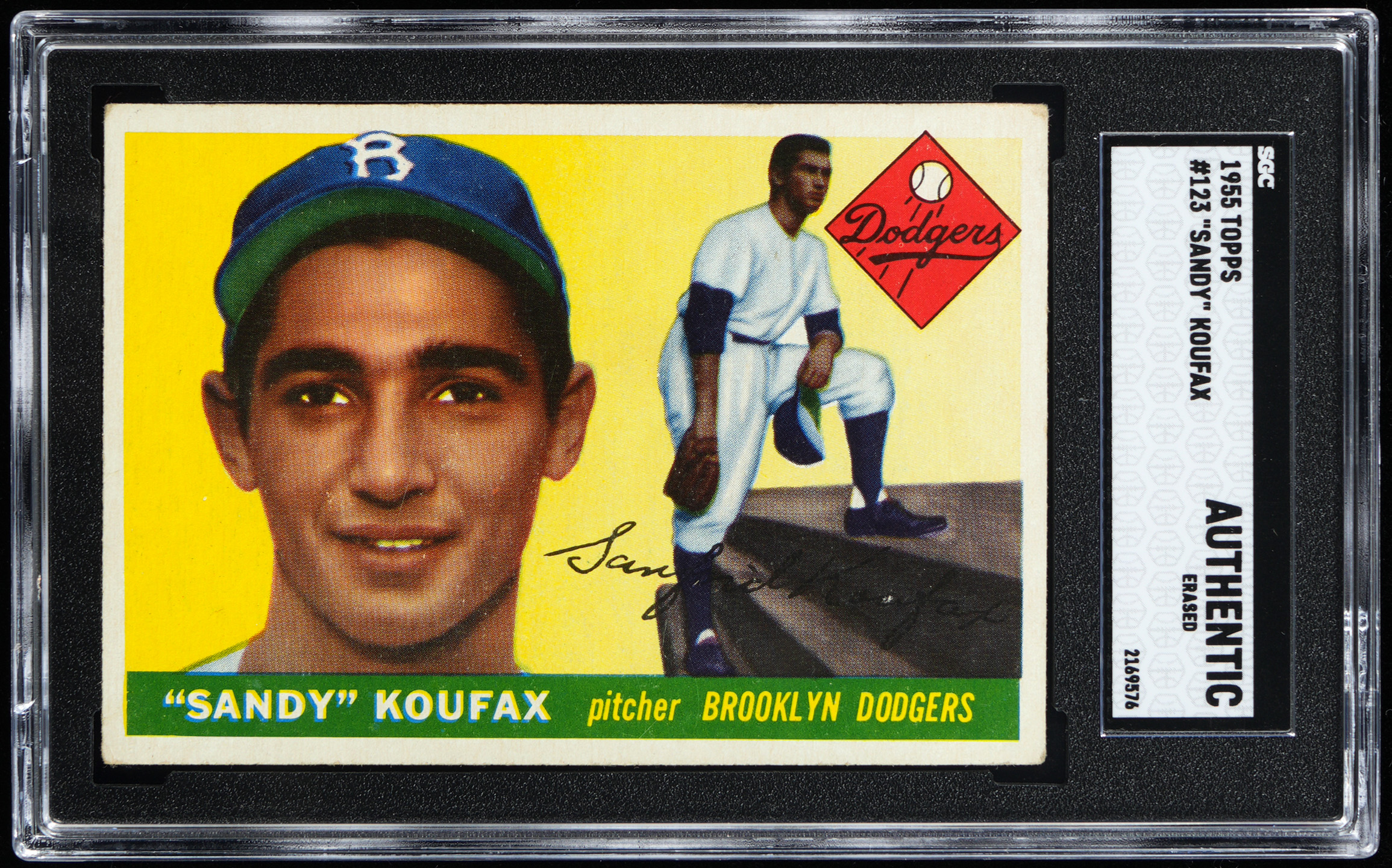Graded Authentic by SGC due to erase marks. Genuine 1955 Topps #123 Sandy Koufax rookie card. Despite the modification, this debut of the Brooklyn Dodgers Hall of Fame ace is crease-free with only moderate corner wear and vibrant surface colors.