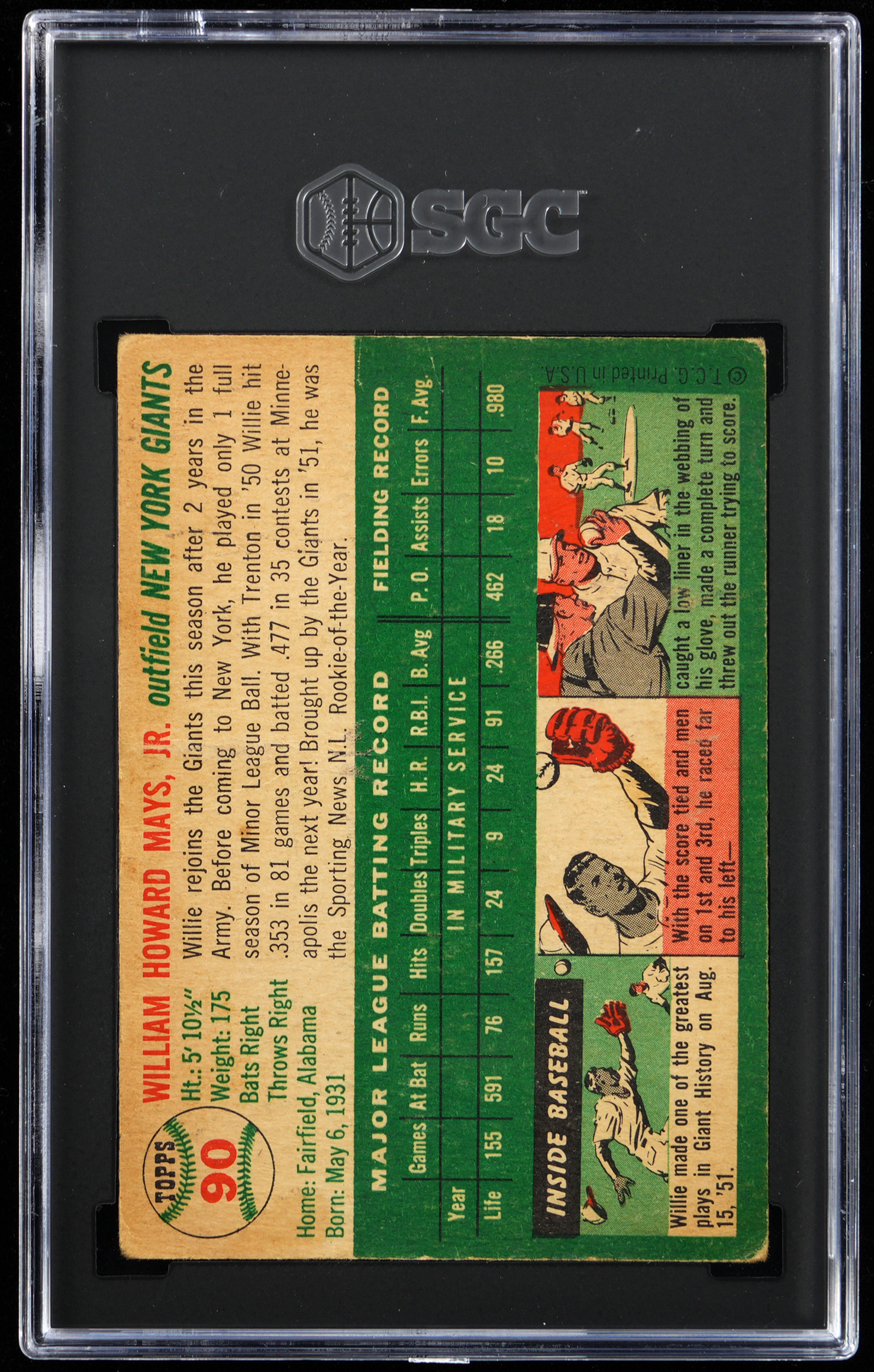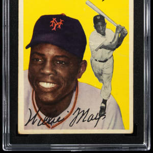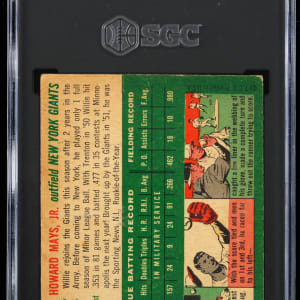 Graded GOOD+ 2.5 by SGC. From the season in which he earned National League MVP honors arrives the offered 1954 Topps #90 Willie Mays single. New York Giants Hall of Famer.