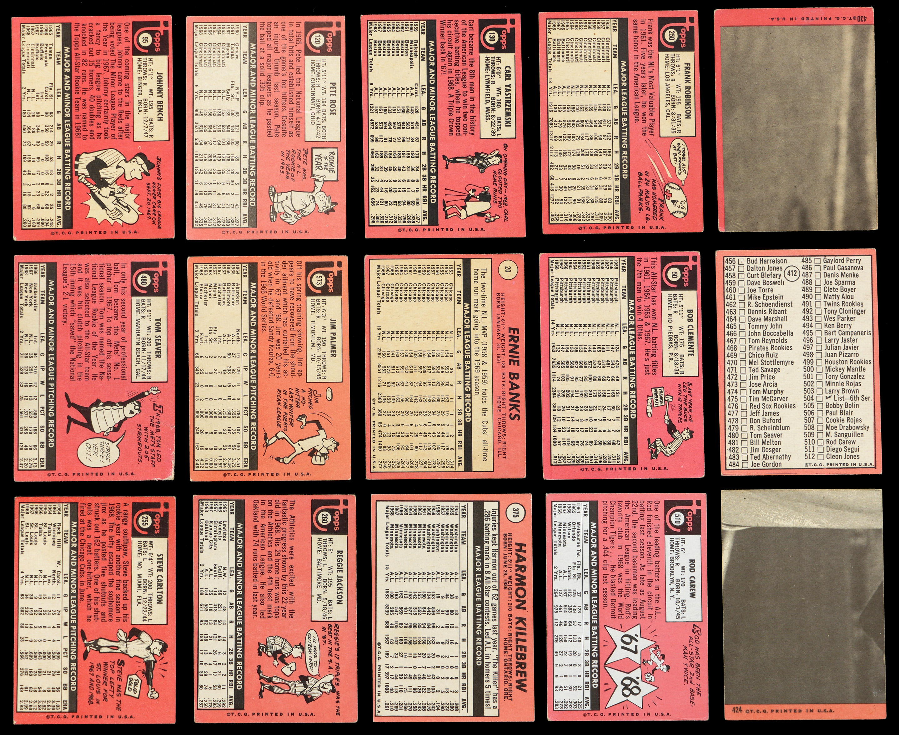 Featured is a 1969 Topps partial set of (459/664) cards that is well on its way toward total completion. This power packed assembly generally presents in the (GD to VG) range with some better or lesser. Highlights include: #1 Yaz/Oliva LL (VG), #20 Banks (GD), #49 Rodriquez ERR (GD), #50 Clemente (GD), #95 Bench (GD), #99 Nettles RC (GD, Black Loop variation), #120 Rose (VG), #130 Yastrzemski (VG-EX), #151 Dalrymple RC (GD), #208 Clendenon (VG-EX, Expos), #250 F. Robinson (VG), #255 Carlton (VG), #260 R. Jackson RC (GD), #375 Killebrew (VG), #412 Mantle CL (VG), #424 Rose AS (VG), #430 Bench AS (GD), #480 Seaver (FR), #510 Carew (GD) and #573 Palmer (GD).