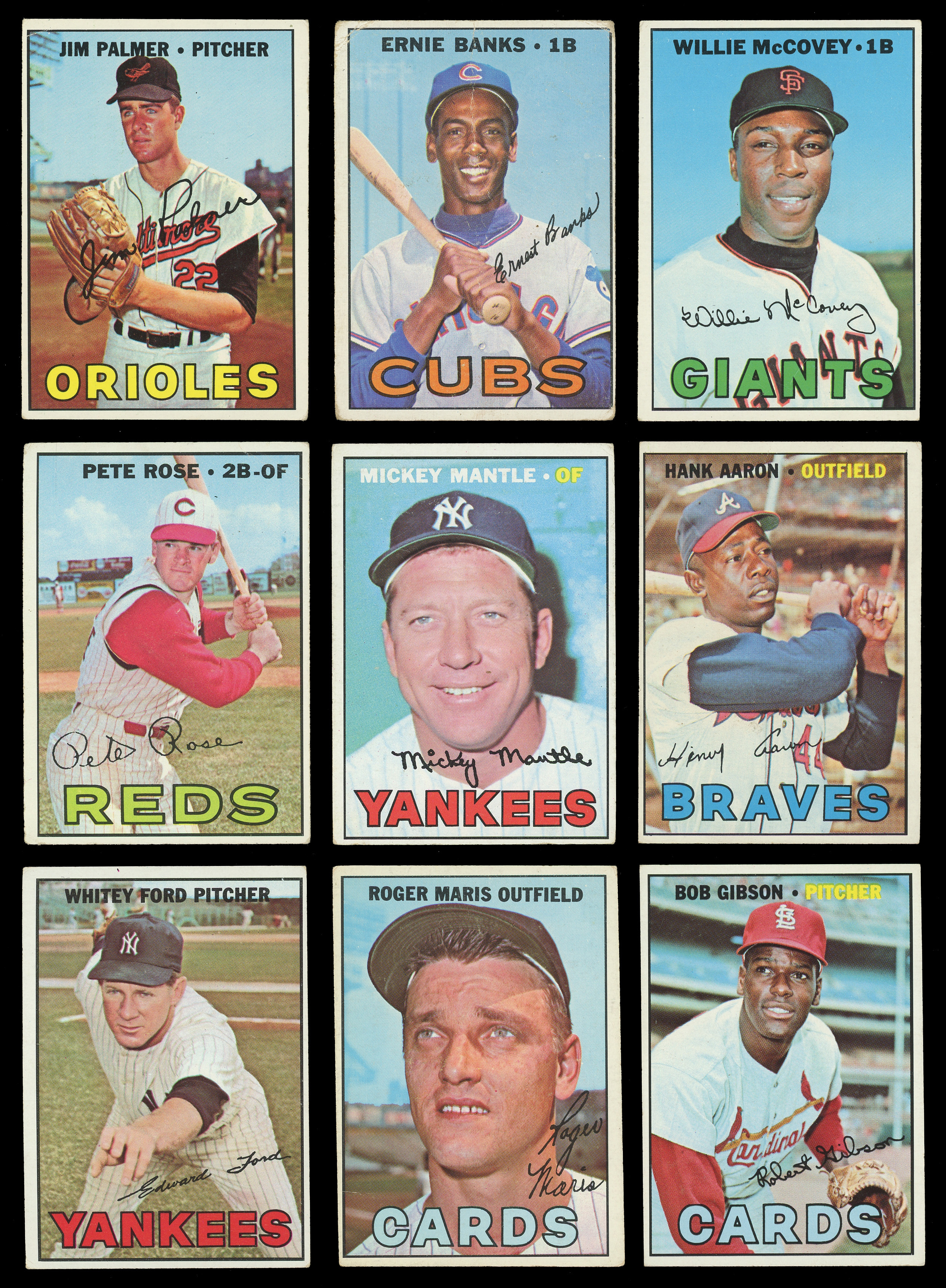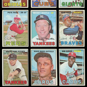 Jump into the offered 1967 Topps partial set of (323/609) cards with (40+) Hall of Famers. This mid-grade assembly generally presents in the (GD to VG) range with some better or lesser. A total of (7) tougher high series are also present (average VG). Highlights include: #1 The Champs (GD), #5 Ford (VG-EX), #30 Kaline (FR), #45 Maris (GD), #103 Mantle CL (GD), #150 Mantle (VG), #210 Gibson (VG-EX), #215 Banks (FR), #250 Aaron (VG), #417 Brucer ERR (GD), #430 Rose (FR), #475 Palmer (GD), #480 McCovey (VG), #500 Marichal (GD), #510 Mazeroski (GD) and #584 Piersall (VG-EX).