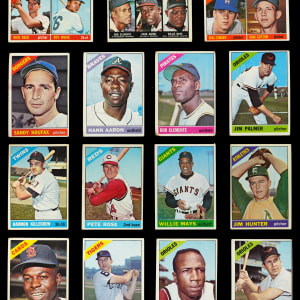Presented is a 1966 Topps starter set of (217/598) cards featuring a strong lineup of period stars. This crew averages overall (GD) condition with some better or lesser. Highlights include: #1 Mays (VG), #30 Rose (VG), #36 Hunter (GD), #100 Koufax (PR), #120 Killebrew (VG), #125 Brock (FR), #126 Palmer RC (GD), #215 N.L. Batting Leaders (GD), #234 R. White RC (GD), #288 Sutton RC (FR), #300 Clemente (PR), #310 F. Robinson (GD), #390 B. Robinson (FR), #410 Kaline (GD) and #500 Aaron (GD).