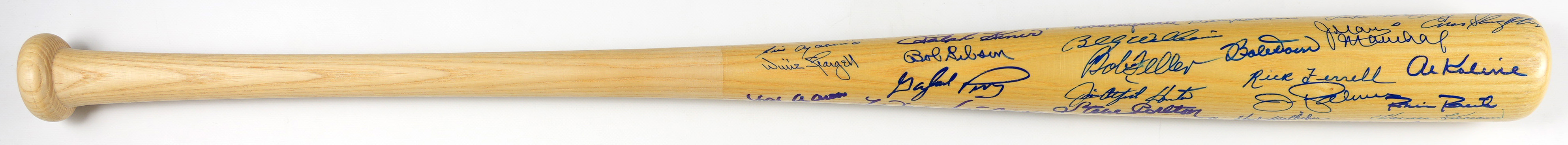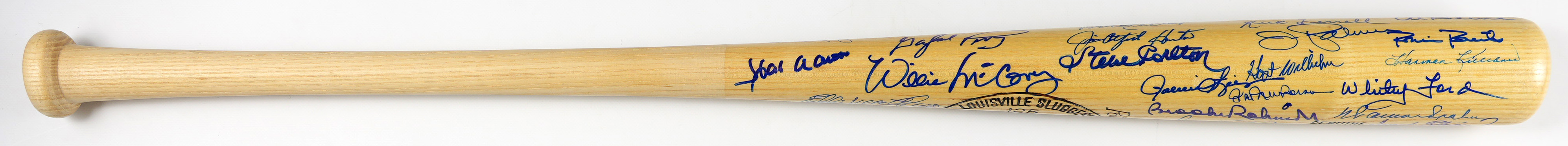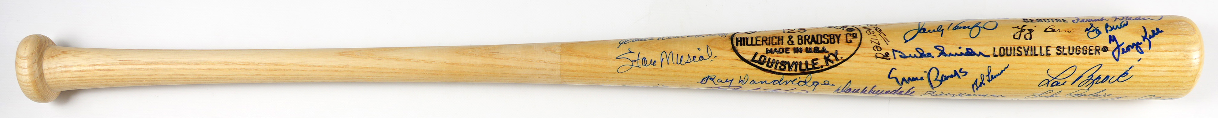 A wealth of prized Hall of Famer autographs is served up, with this multi-signed bat. Reporting in excellent condition, this Louisville Slugger is a "Yogi" Berra signature model. The signature tally is (39), and all are potent, blue felt-tip pen applications.