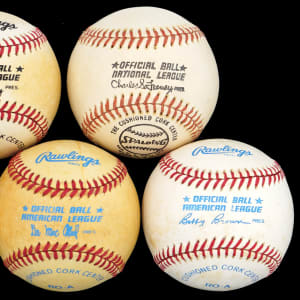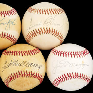 Four power hitters and one power pitcher make up this great group Hall of Fame single-signed baseballs.