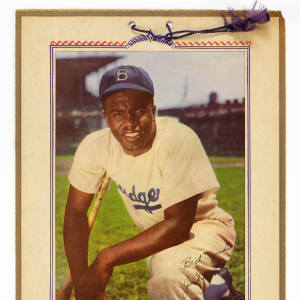 Jackie Robinson makes a welcome appearance, with this 1952 Direct Advertising Company wall calendar. Reporting as complete, with a a 12-month calendar of tear-off pages at bottom, this vintage advertising piece is printed with information for a local charter bus transportation company, based in Cambridge, Maryland. This piece is sized at 10" x 17" overall, with a photograph of Robinson printed with a facsimile signature, affixed to the backer. The cover frame is sized slightly smaller than the backer, revealing the Robinson photograph in a 7" x 9-1/2" window. Purposed for wall-hanging, a length of purple twine is threaded through a couple of hole punches at top. Signs of attrition are relatively modest, with the worst affliction being a small bit of surface loss at the top-right corner of the backer. The Robinson photograph is crisp and clean, as are the calendar pages, and this piece remains very attractive.