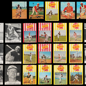 Sharp Regionals! "The Wiener the World Awaited" delivers big-time with the offered 1961-1969 Kahn's Wieners collection of (29) cards. Includes: 1961 Kahn's Cincinnati Reds: (7 cards, average NM) with Brosnan, Coleman, Freese, Hook, O'Toole, Post, Purkey; 1962 Kahn's: (5 cards, average NM) with Brosnan, Cline (Cleveland back), Henry, Kasko, Kirkland (Cleveland back); 1964 Kahn's: (4 cards, average NM) with Clendenon, Edwards, Harper, Tsitouris; 1966 Kahn's: (3 cards, all with tabs, average NM to NM-MT) with Bailey, F. Bolling, M. Jones; 1969 Kahn's Yellow Stripes: (7 cards, all with tabs, average NM to NM-MT) with M. Alou, Horlen, Peters, Santo (NM), Tiant, Torre (NM-MT), Veale; 1969 Kahn's Red Stripes: (3 cards, all with tabs, average NM) with L. May, Mazeroski (EX-MT) and McDowell.