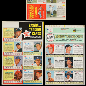The offered trio of 1961-1962 Post Cereal Baseball and Football uncut panels were expertly extracted from period cereal boxes. This compilation of (16) players is largely crease-free with crisp foundations and fresh surface colors. Includes: 1.) 1961 Post Cereal Baseball 6-card panel with #13, 21, 96, 116, 153, 185; 2.) 1962 Post Cereal Baseball 7-card panel with #3, 16, #29 B. Robinson, 159, 169, 182, 192; 3.) 1962 Post Cereal Football 3-card panel with #19, #38 McDonald and 56.