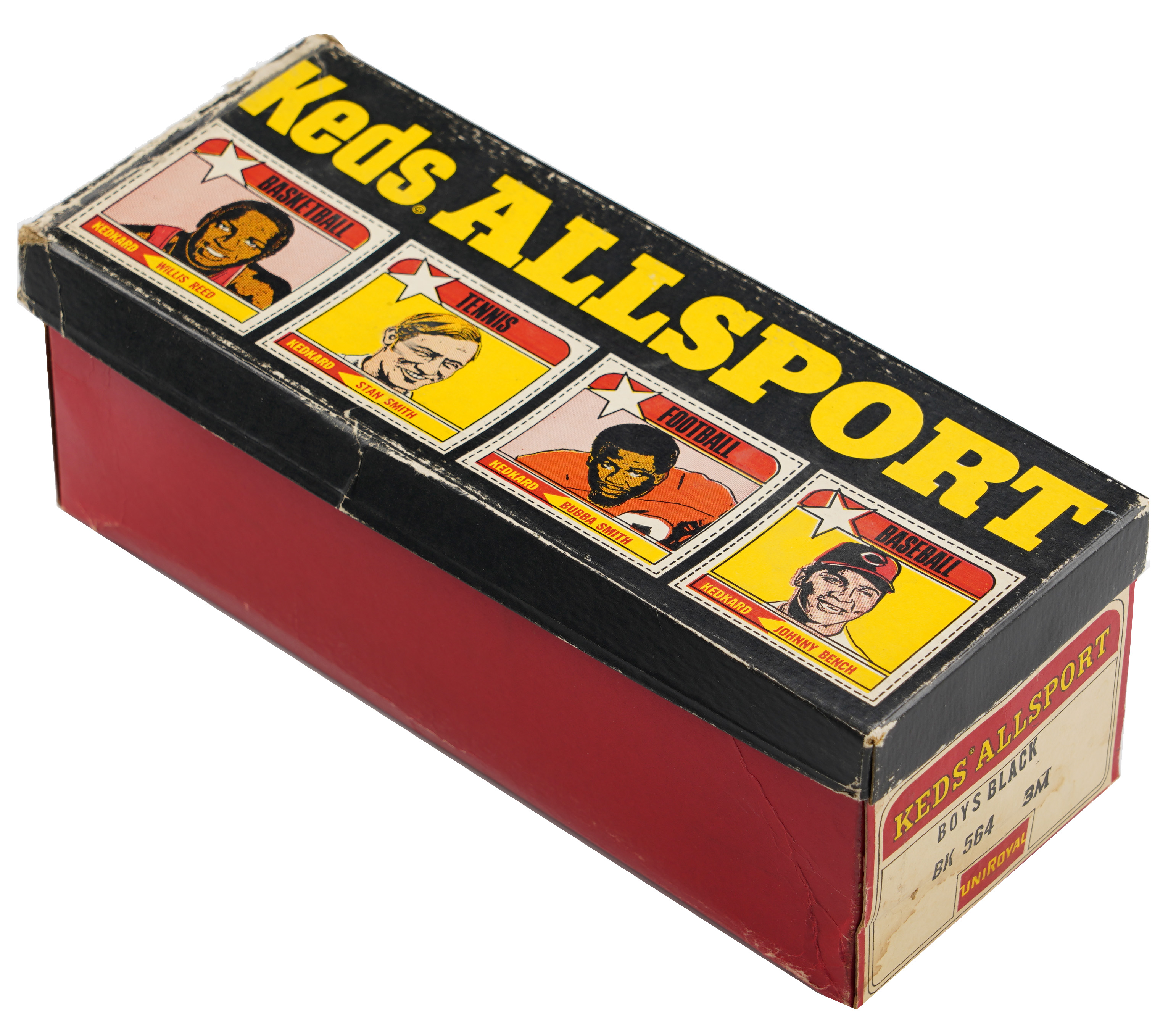 Kids got a little something extra in 1971, with the purchase of a pair these Keds Allsport athletic shoes. The something extra came in the form of four multi-sport trading cards, printed on the lid. While the perimeter of the lid shows considerable wear, the cards have favorably escaped any more than minor attrition. Featured stars are Willis Reed, Stan Smith (small crease at bottom), "Bubba" Smith, and Johnny Bench. The brand "Keds Allsport" is announced in large lettering, above the cards. The graphics are distinct, and the colors remain vibrant. The box is unadorned, save for one end panel printed with more branding, and stamped with "Boys Black BK 564 3M". Accented with white stripes, the black canvas shoes appear to be unused, though the stripes are moderately stained at the ends. The laces are intact, as are the Keds blue rubber labels on the heels, and the soles are marked "Made In USA".
