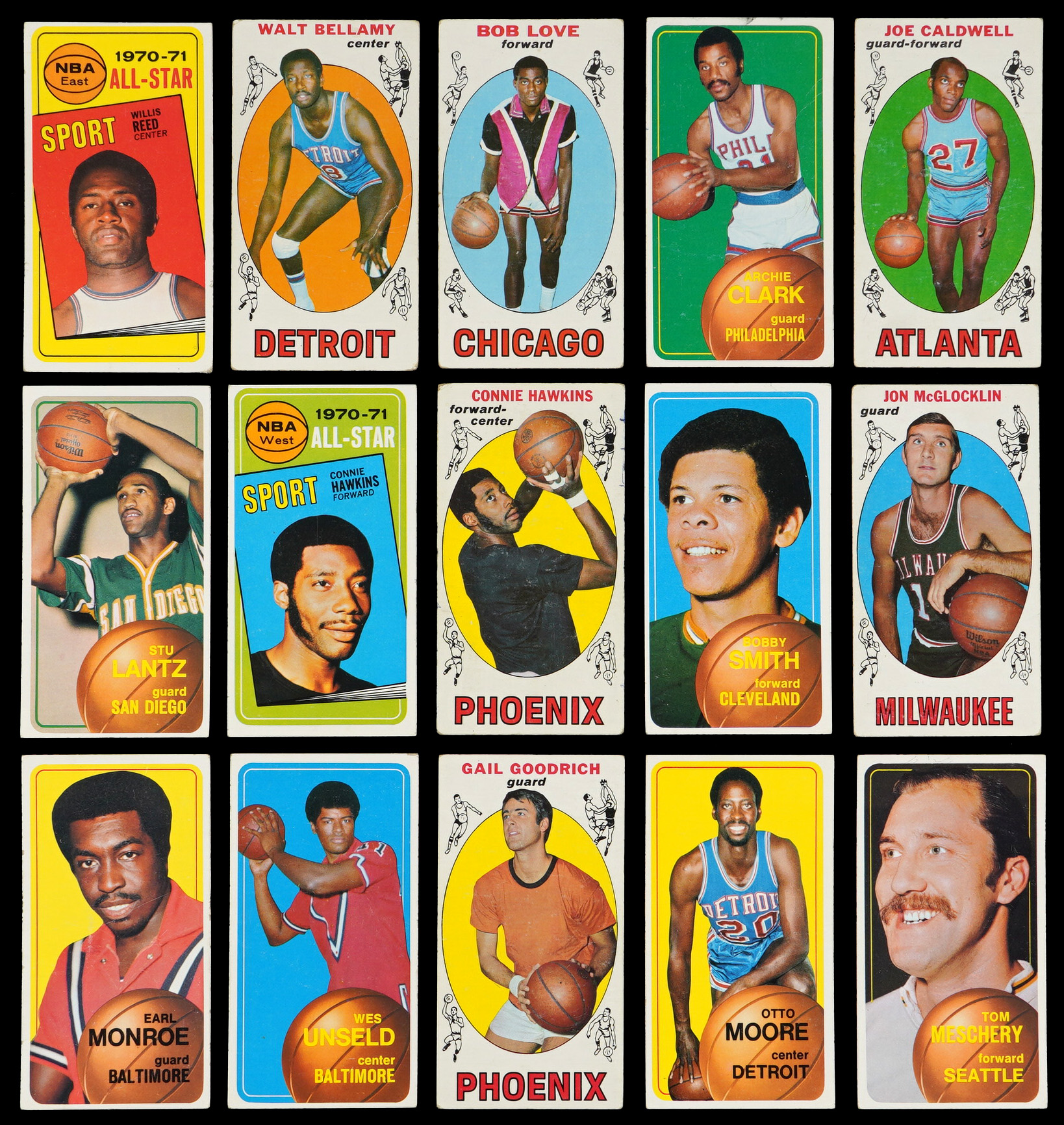 1969-1970 Topps: (50 cards, average FR to GD) with #2 Goodrich RC (GD), #14 McGlocklin RC (GD), #15 Hawkins RC (PR, pen marks), #20 Havlicek RC (FR), #43 Bradley RC (FR), #44 Wilkens (FR), #55 Bing RC (GD), #78 Love RC (GD), #82 Nelson RC (GD), #98 Frazier RC (GD);