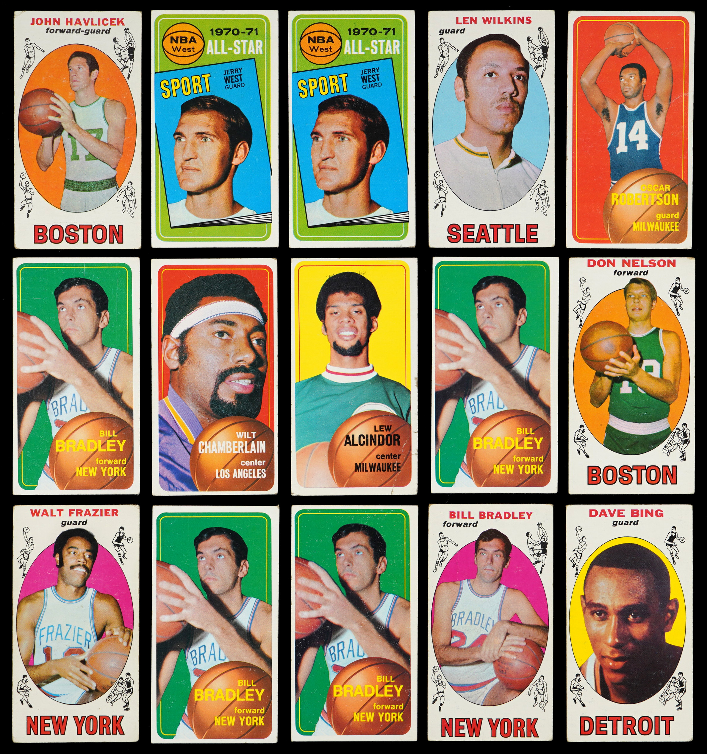 1970-1971 Topps: (122 cards, average VG) with (4) #7 Bradley (average VG-EX), #50 Chamberlain (VG), #75 Alcindor (FR), #100 Robertson (GD), (2) #107 West AS (VG, FR)