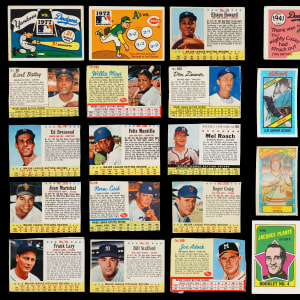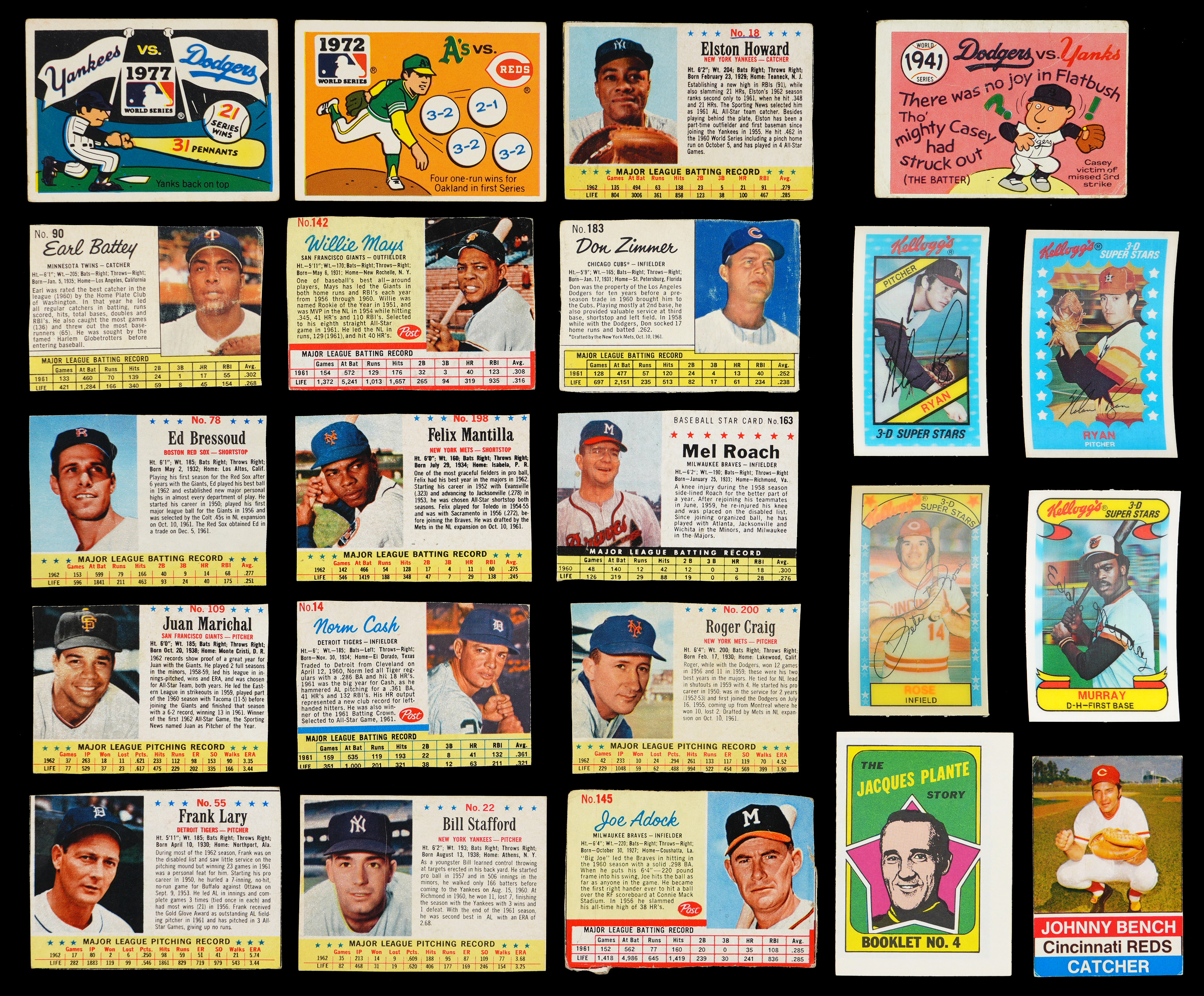 1960s Singles: (385 cards, average GD to VG) with (17) 1961 Golden Press, (33) 1961 Post: #154 Sanford (VG), #163 Roach (EX); (89) 1962 Post: #14 Cash (GD, Throws Right), #142 Mays (VG), #145 Adcock ERR (GD), #155 Willey (FR); (29) 1963 Post: #18 E. Howard (PR, writing), #22 Stafford (EX), #31 Rodgers (PR, writing), #55 Lary (VG), #63 Snyder (VG), #73 Luplow (VG-EX), #78 Bressoud (GD), #103 Pagan (VG-EX), #109 Marichal (VG), #122 S. Williams (GD), #198 Mantilla (VG), #200 Craig (GD); (35) 1965 Topps Embossed, (18) 1967 Topps Pin-Ups, (40) 1968 Topps Game, (24) 1969 MLBPA Photostamps, (83) 1969 Topps Deckle, (17) assorted singles in smaller quantities with 1962 Jell-O: #90 Battey (GD) and #183 Zimmer (GD) as the keys;