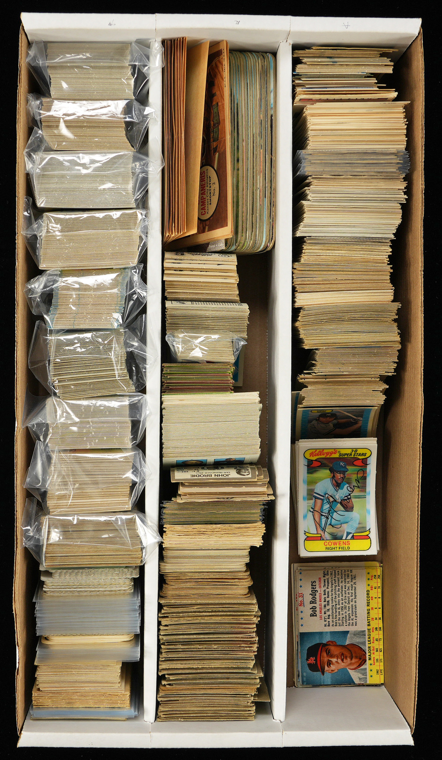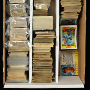 1970s-1980s Singles: (658 cards, average VG to EX) with (18) 1970 Fleer World Series, (18) 1970 Topps Scratch-Offs (mostly unscratched), (20) 1970 Topps Story Booklets, (20) 1970 Topps Super, (41) 1971-1980 Fleer World Series: #70 1972 World Series (VG), #75 1977 World Series (VG); (25) 1972 Kellogg’s, (37) 1972 TCMA The 1930’s, (47) 1974 Kellogg’s, (10) 1975 Hostess, (16) 1975 Kellogg’s, (28) 1975 TCMA All-Time Greats, (16) 1975 TCMA 1927 New York Yankees, (34) 1975 TCMA 1946 Boston Red Sox near, (24) 1975 TCMA Appleton Foxes, (15) 1975 TCMA Cedar Rapids Giants, (18) 1975 TCMA Iowa Oaks, (19) 1975 TCMA Shreveport Captains, (16) 1976 Hostess: #22 Bench (VG); (24) 1978 Kellogg’s, (45) 1981 Topps Scratch-Offs (mostly scratched), (44) 1982 Kellogg’s, (57) 1983 Kellogg’s (near set), (66) assorted singles in smaller quantities;