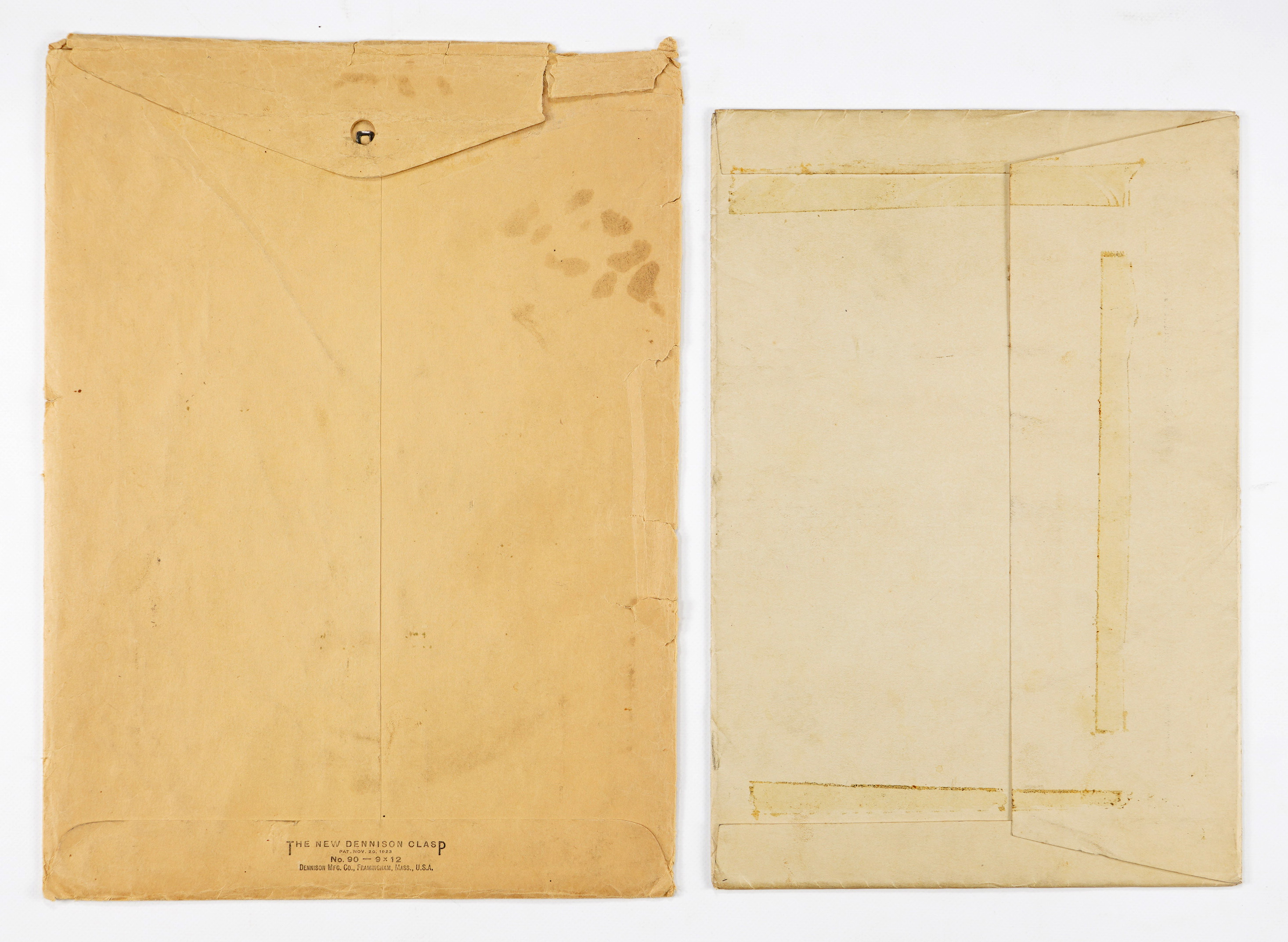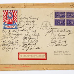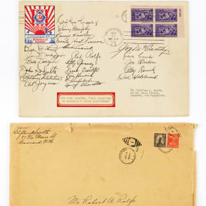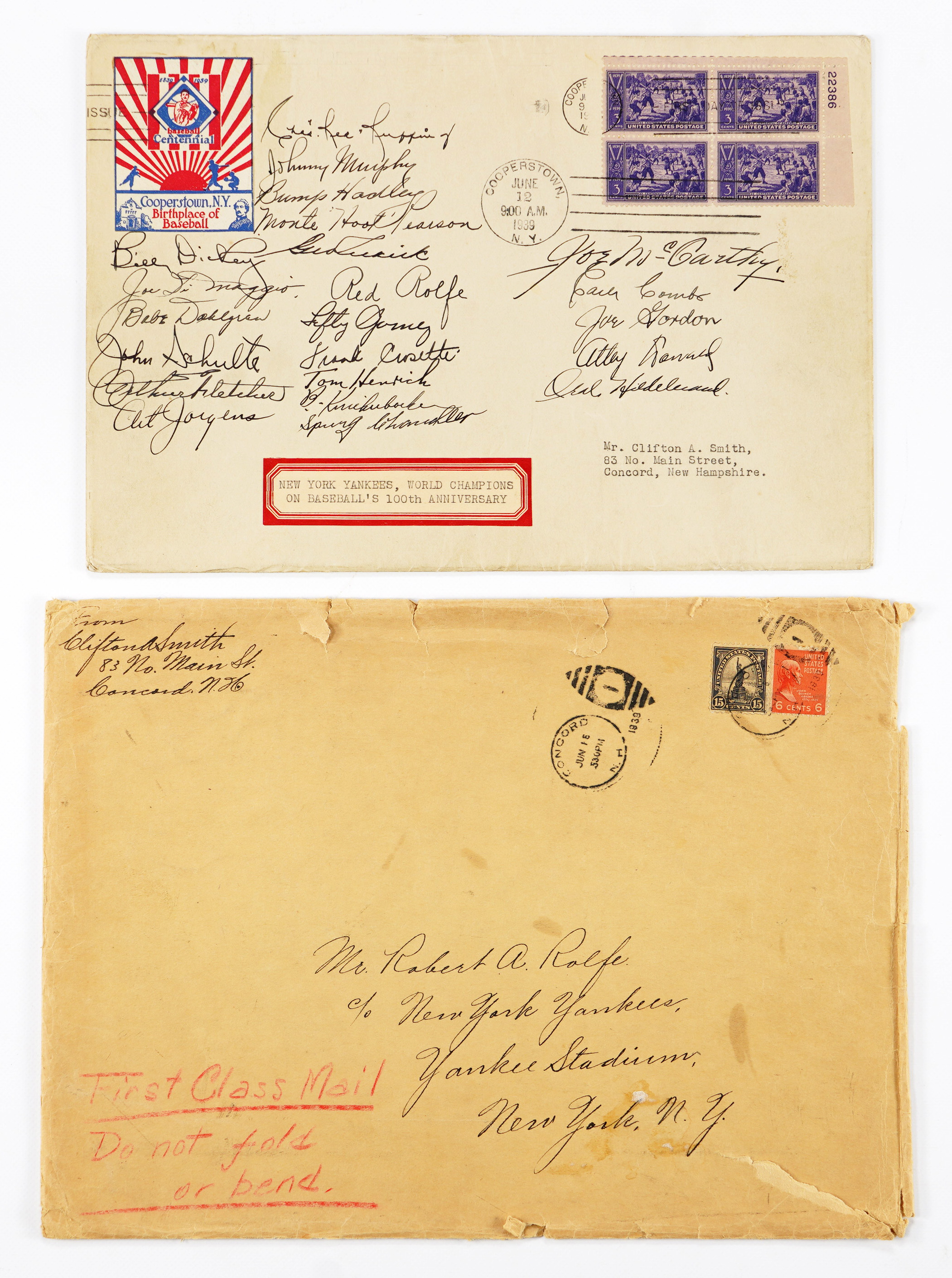 Baseball was celebrating its 100th Anniversary, and the New York Yankees were headed for a then record fourth consecutive World Series championship, when this oversized 1939 Baseball Centennial envelope was issued by the Hall of Fame. Sized at 11" x 7-1/2", this celebratory souvenir is decorated with a Baseball Centennial logo at upper-left, and four Centennial postage stamps at upper-right. The stamps are cancelled with a Cooperstown postmark dated June 12, 1939. This date was the first day of issue for this commemorative postage stamp type. Typed at lower-right, is the name of the addressee, Mr. Clifton A. Smith, of Concord, New Hampshire. Accompanying is a manila envelope that's a bit larger than the Centennial envelope. This manila mailer is addressed by Smith, to Mr. Robert A. Rolfe, known best to fans as "Red". Postmarked dated June 18, 1939, this manila envelope was obviously employed by Smith to send the Centennial envelope to Rolfe, care of the New York Yankees.