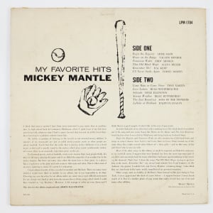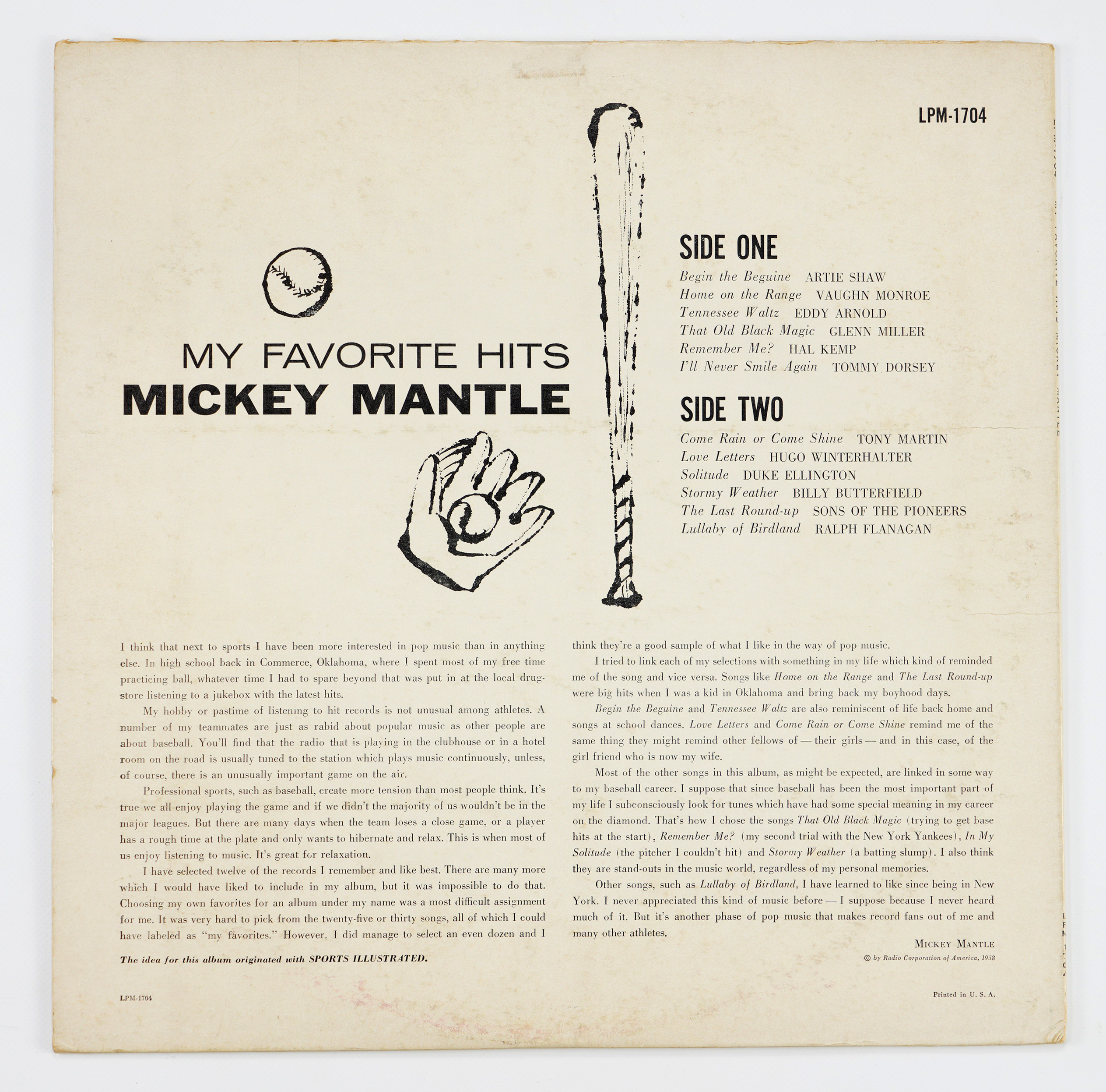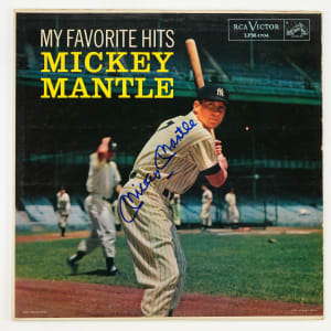 Make a musical connection with legendary slugger Mickey Mantle, when you score this signed 1958 RCA Victor "My Favorite Hits" record album. Released when Mickey was in his prime with the New York Yankees, this vintage album features a dozen popular standards, selected as his personal favorite songs. The record disc appears to be unplayed, while the album cover has a 4" split on the top edge, and the inner sleeve is chewed up on the top edge. Graced with a radiant Mantle batting pose, the album cover is attractive, and well-suited for framed display. Mantle has applied a bold, flawless signature over his pinstriped uniform.