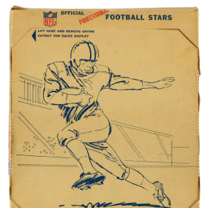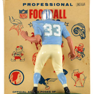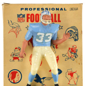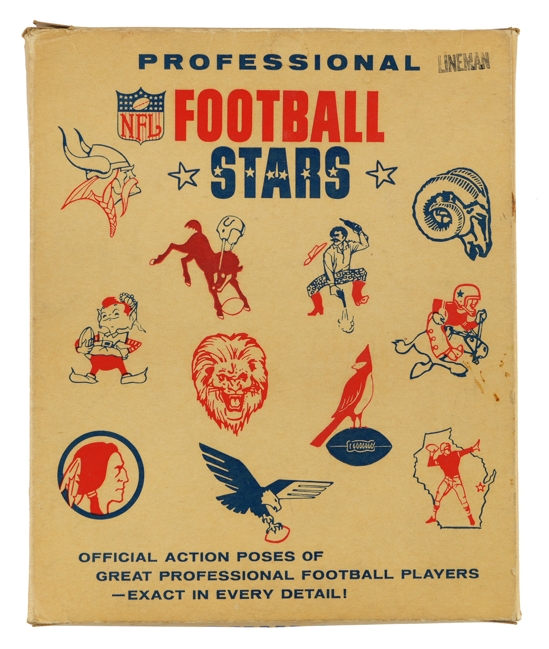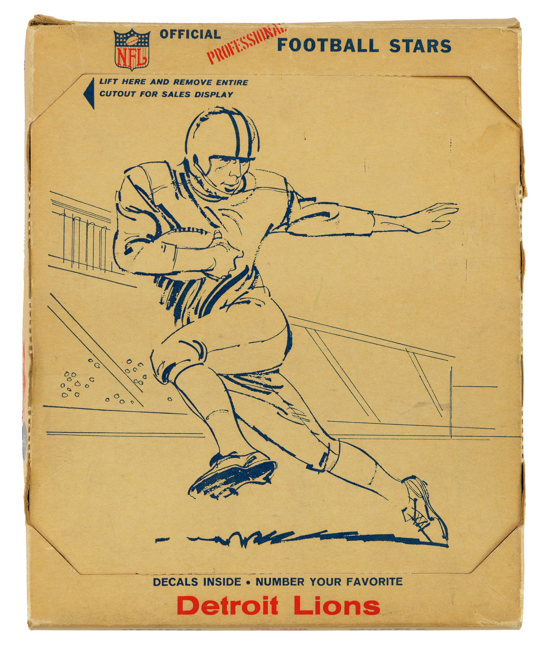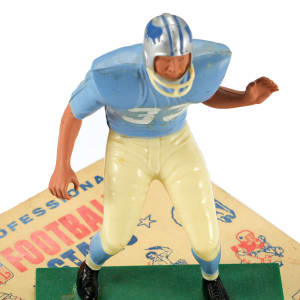 Hartland Detroit Lions lineman in original box is clean and attractive, with deference to moderate wear on the jersey number decals. The gold base lettering is full and bright, the helmet logos are full, the blue jersey and socks paint is strong, and the pants are slightly off-white. Complete with all flaps attached, the box retains a pleasing shape, and shows light to moderate wear.