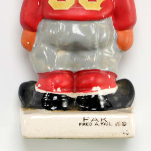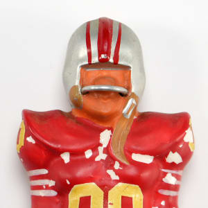 Kail San Francisco 49ers Joe Jolter lineman statue is a 5-1/2" tall model, with multiple spots of surface paint loss on the jersey. The team decal on the front of the base is strong, and the Kail logo on the back is distinct. The faceguard bar is firmly attached, and the helmet is bold, though there are a couple of nicks on the back. The moderate wear is in keeping with the age of this vintage figure, and display appeal is more than ample.