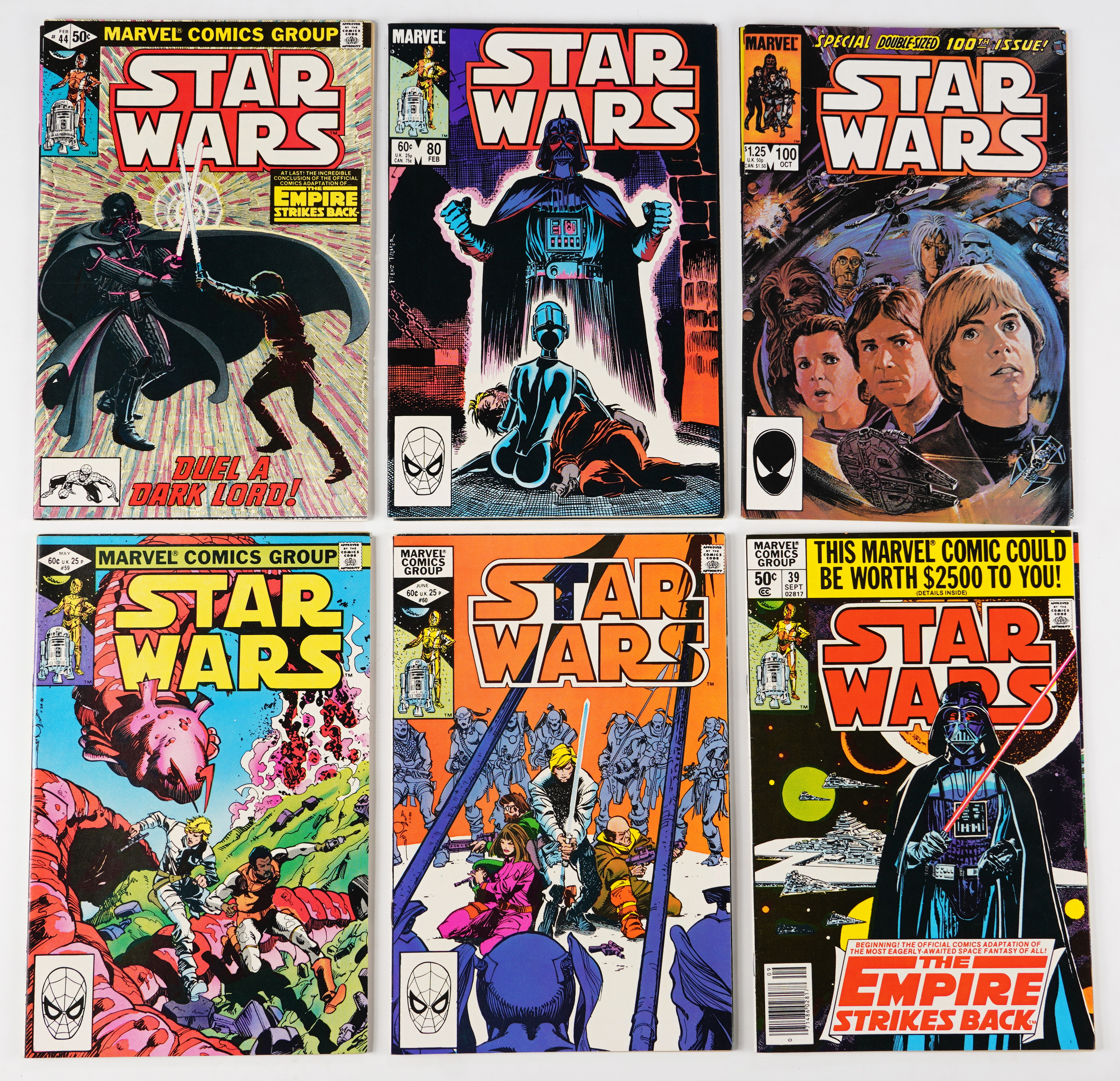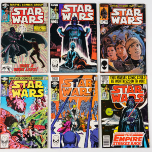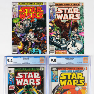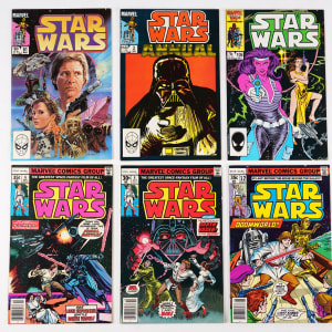 Get a big jump on Marvel’s classic 1977-1986 Star Wars run, with this near-complete set of (93/110). Covering the action from the first three Star Wars film releases and then some, this collector favorite series is truly an object of affection for aspiring Jedi. Cover appearances include Sci-Fi icons Luke Skywalker, Princess Leia, Han Solo, Chewbacca, C3PO, R2D2, Obi-Wan Kenobi, and of course, Darth Vader. Condition is favorable throughout this nicely preserved collection, ranging 80% VF-NM to NM+, 20% FN to VF+. In all, the Marvel Star Wars run is comprised with 107 regular issues, and 3 annuals, so this offering puts you 85% of the way along the path to completion.