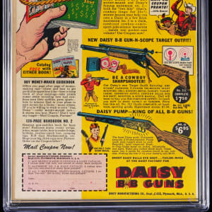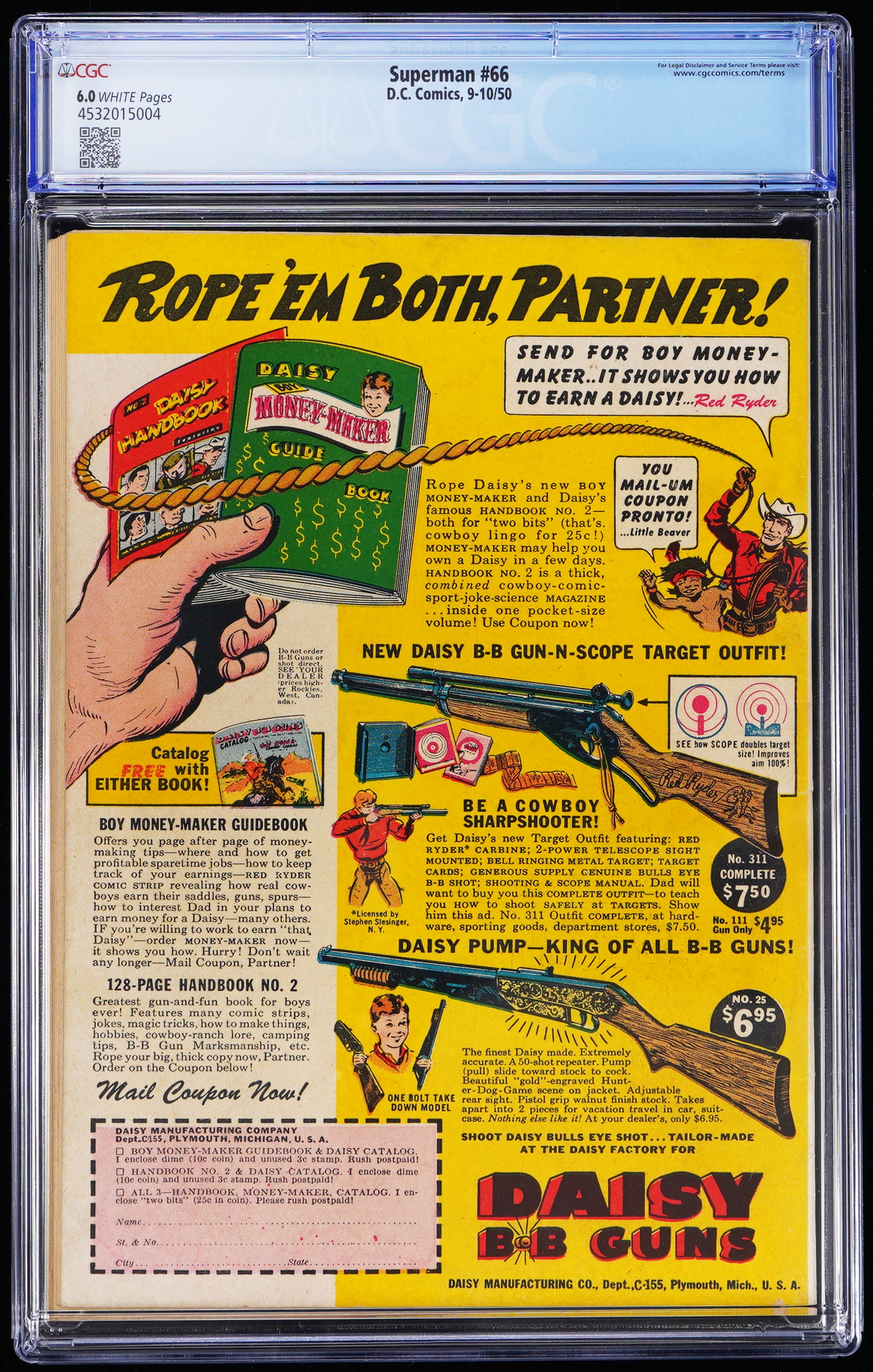 Golden Age comic book seekers find a solid gold nugget, with this 9-10/50 DC Superman issue #66. Formatted with "52 Big Pages", this beefy issue has a lot going for it. Several heavyweight comic creators made contributions to this comic, including a baseball game cover with Superman crushing it. There's also the second Superbaby story, a visit from the Prankster, a Kryptonite threat, and an inside cover advertisement for Strange Adventures #1. Finally, there's the pleasing 6.0, White Pages grade provided by leading certification service CGC. Label notes are "Bill Woolfolk and Alvin Schwartz stories, Wayne Boring, Al Plastino and Stan Kaye art. Prankster appearance. Interior Cover Ad for Strange Adventures #1".
