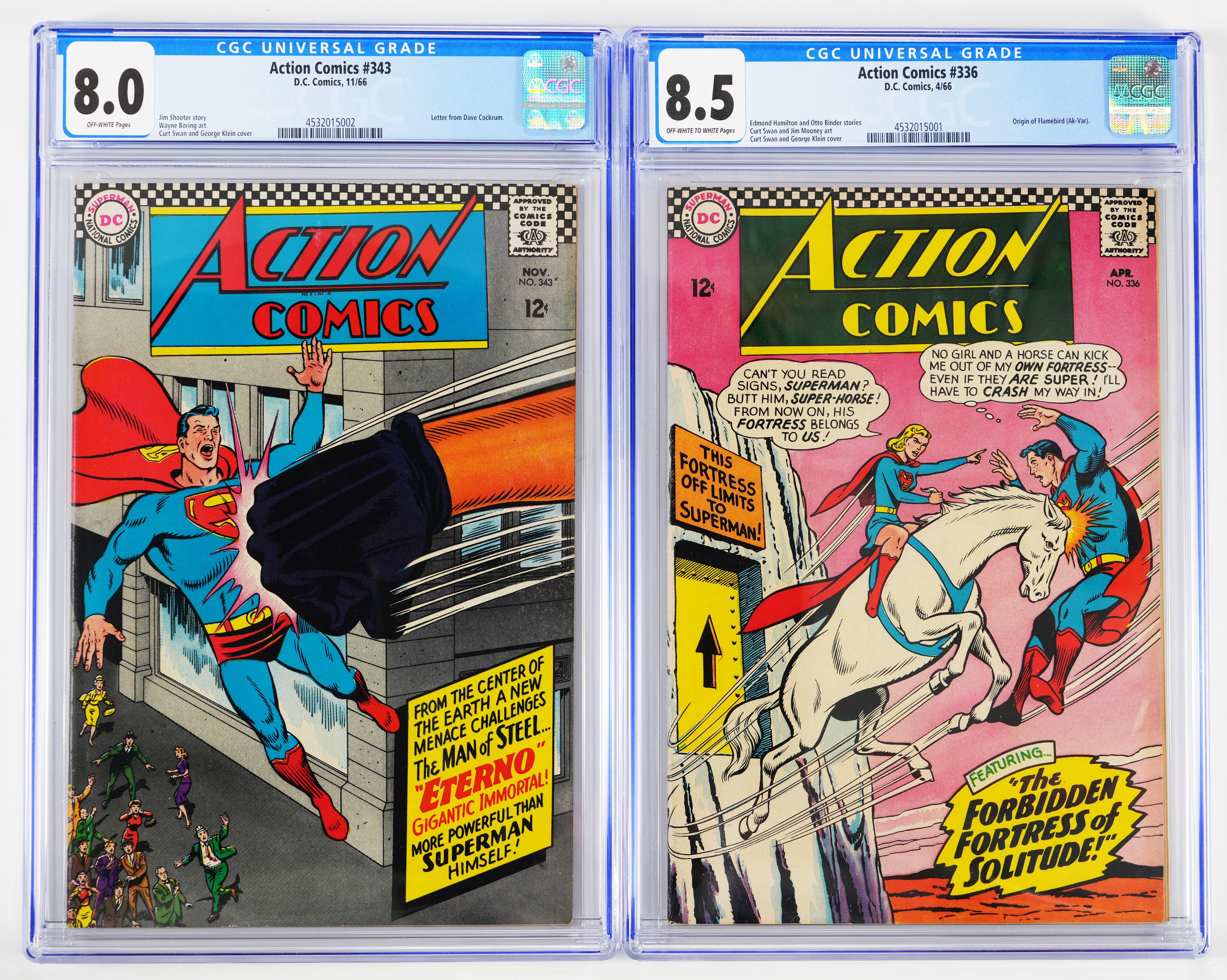 11/66 Action Comics #343 is graded CGC 8.0, Off-White Pages. Creators are Jim Shooter story, Wayne Boring art, Curt Swan and George Klein cover. A letter from Dave Cockrum is noted.
