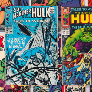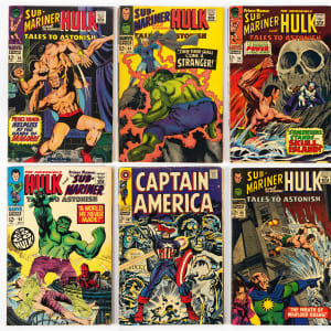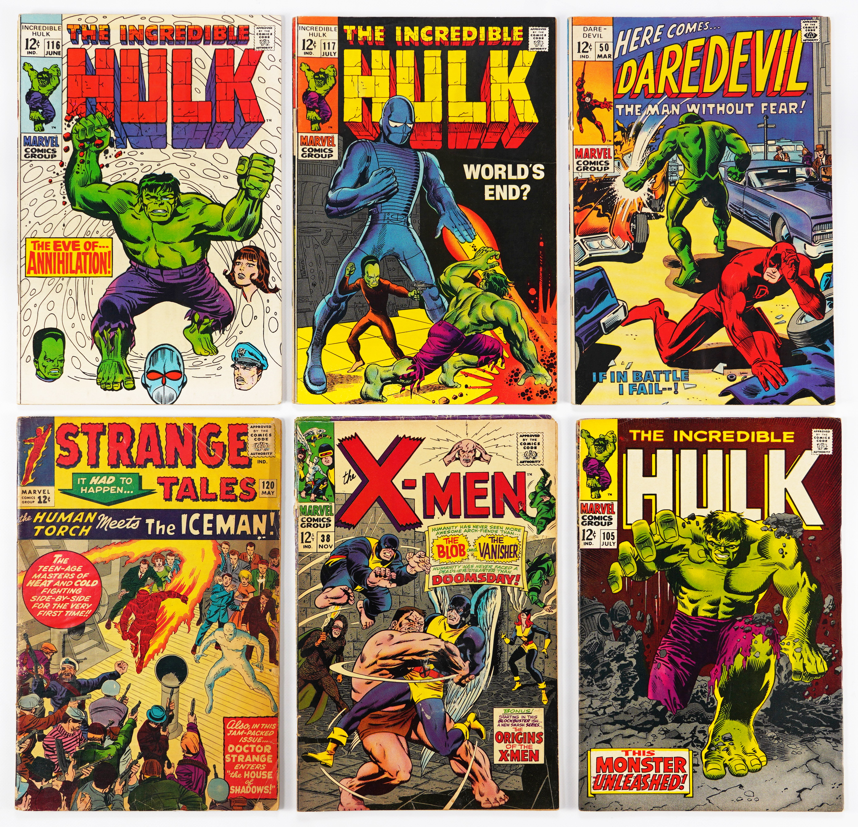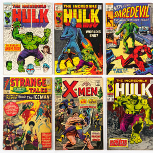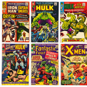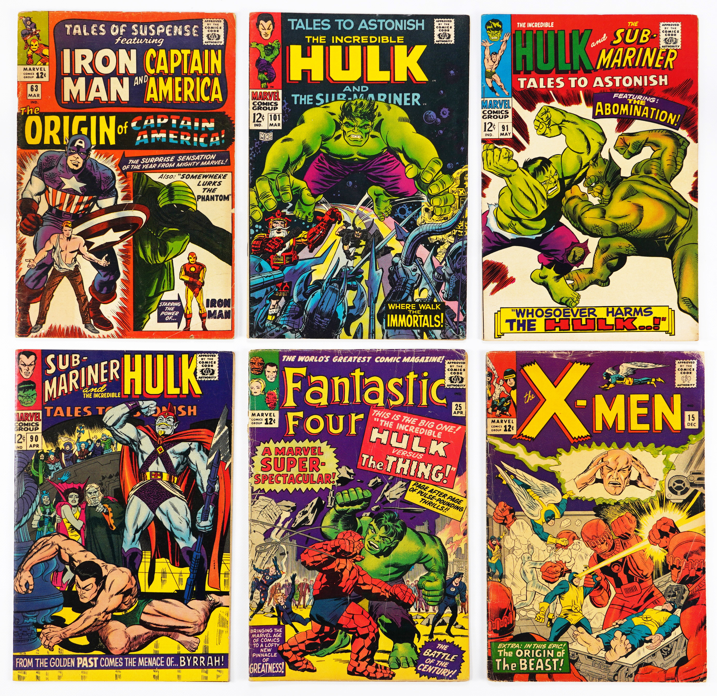 A visual feast is prepared, with this 1960s Marvel 12-cent super-hero comic book collection (20). This Silver Age extravaganza is packed with popular heroes Hulk, Thing, The X-Men, Captain America, and others. These classic titles and iconic heroes put Marvel on the map when it re-branded from the Atlas banner in 1961, and all are fan favorites.