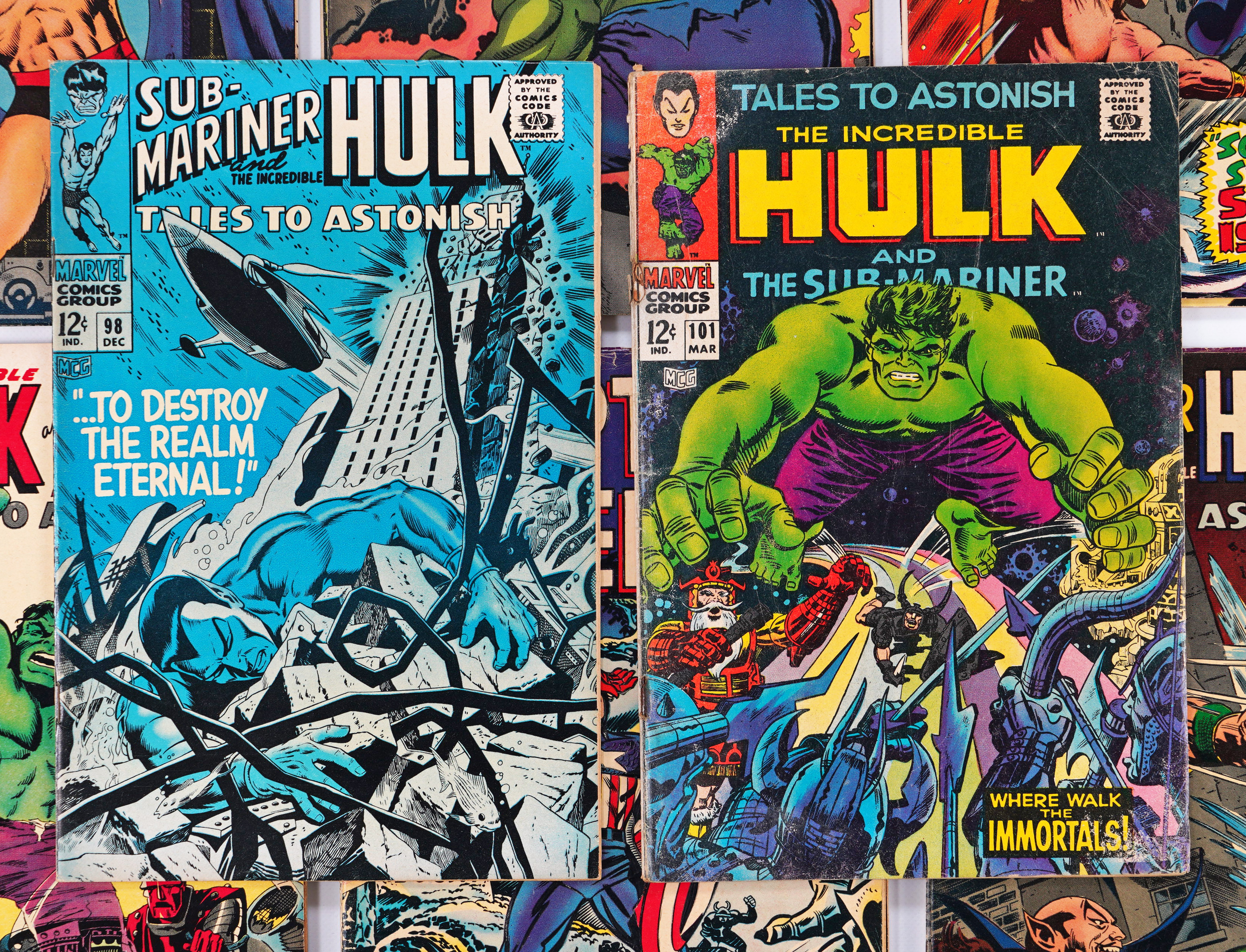 Tales to Astonish (10): #86 Sub-Mariner cover VF-, #89 Hulk cover FN-VF, #90 first appearance of Abomination FN+, #91 Abomination debut continues with first cover appearance FN-VF, #94 Sub-Mariner cover FN-VF, #95 Hulk cover FN-VF, #96 Sub-Mariner cover FN-VF, #98 Sub-Mariner cover FN-VF, #101 Hulk cover, final issue (X2) FN-VF, GD-.