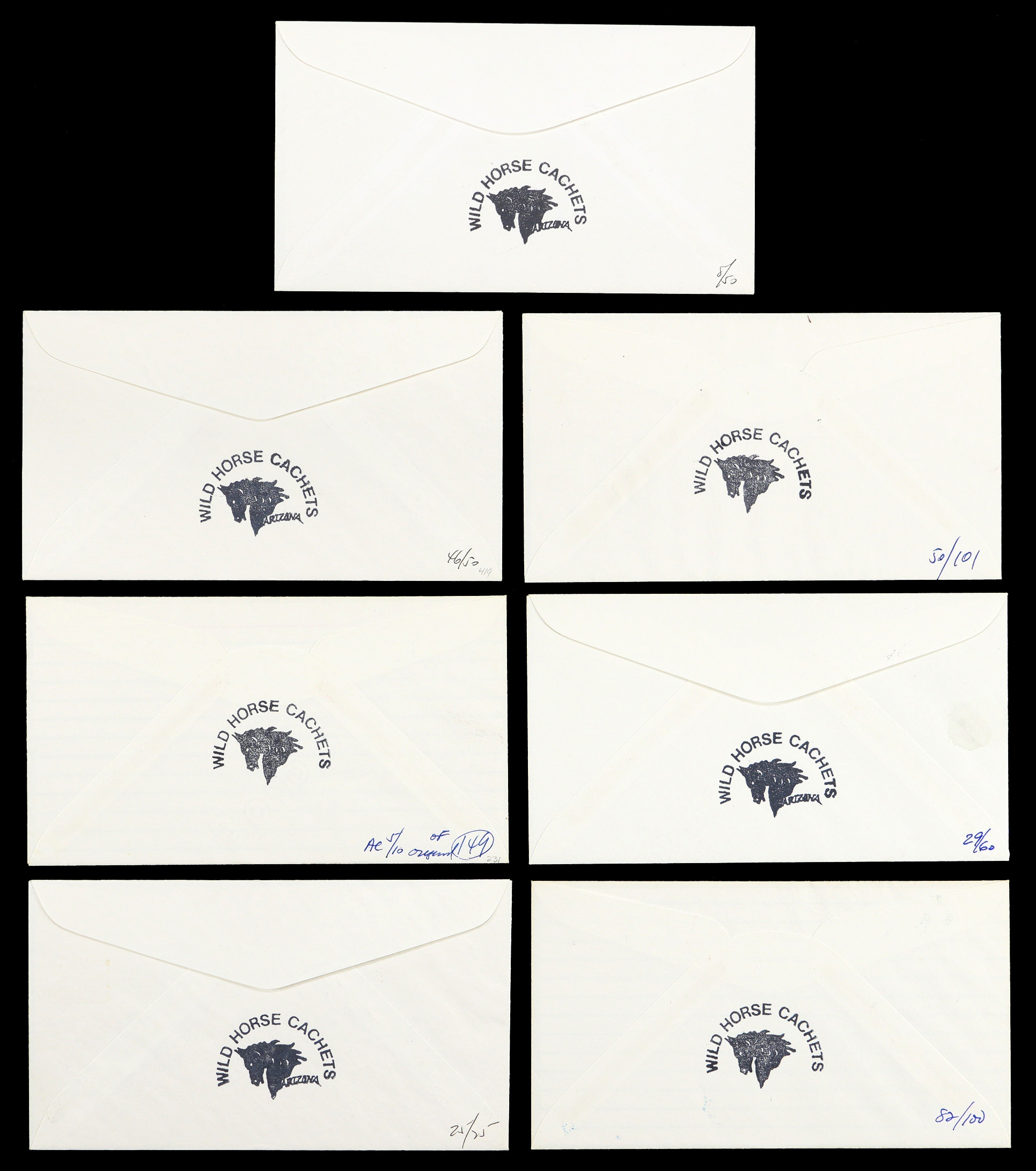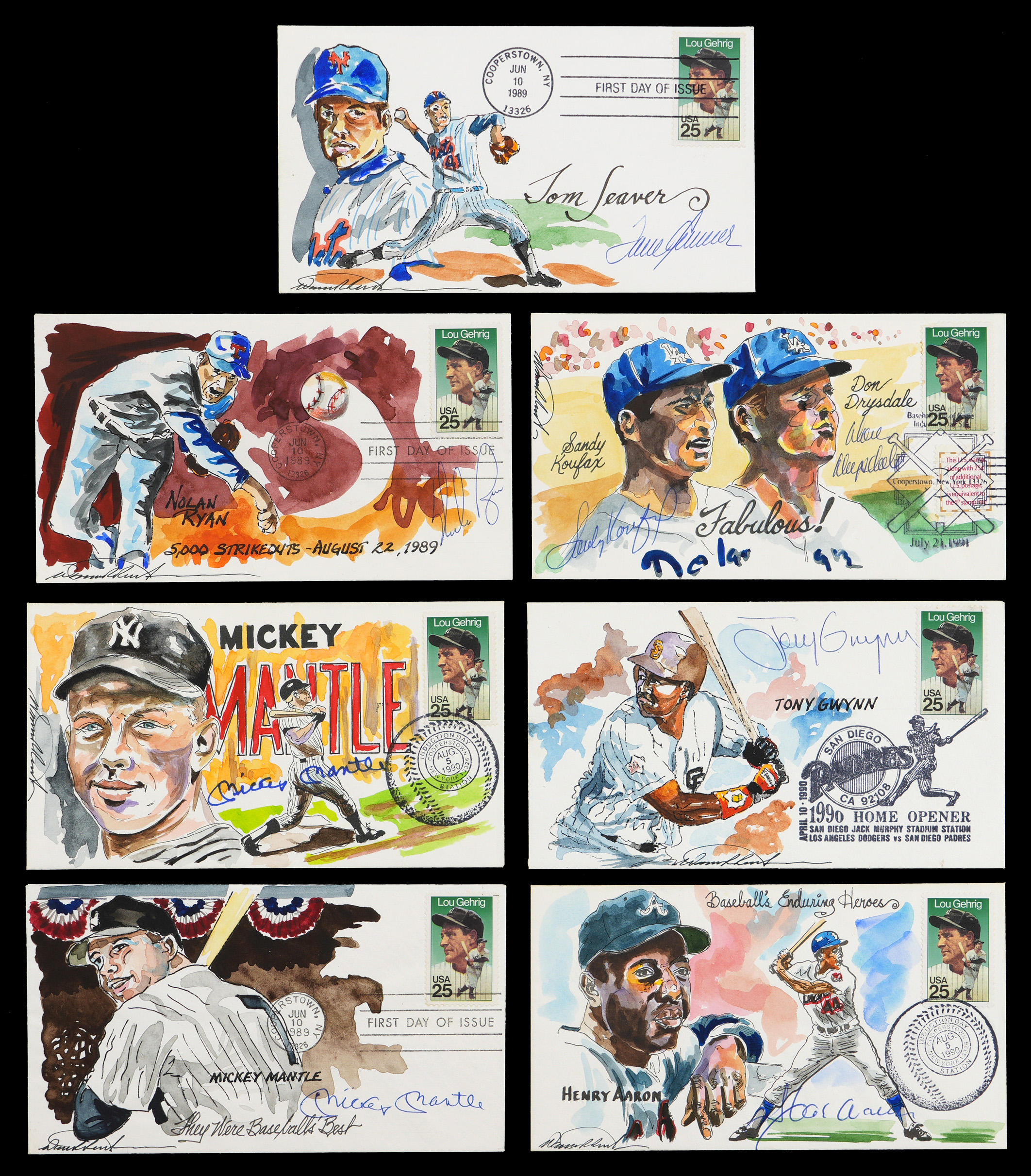 Blessed with multiple layers of appeal, this colorful collection of (7) Hall of Famer signed Wild Horse cachets is a real winner. Captivating artwork, Lou Gehrig postage stamps, and pertinent USPS postmarks decorate these handsome cachets, satisfying art aficionados, stamp collectors, and baseball fans. On top of all that, each is adorned with a prized signature, provided by one or more illustrious Hall of Famers. Both the signatures and cachets show high quality.