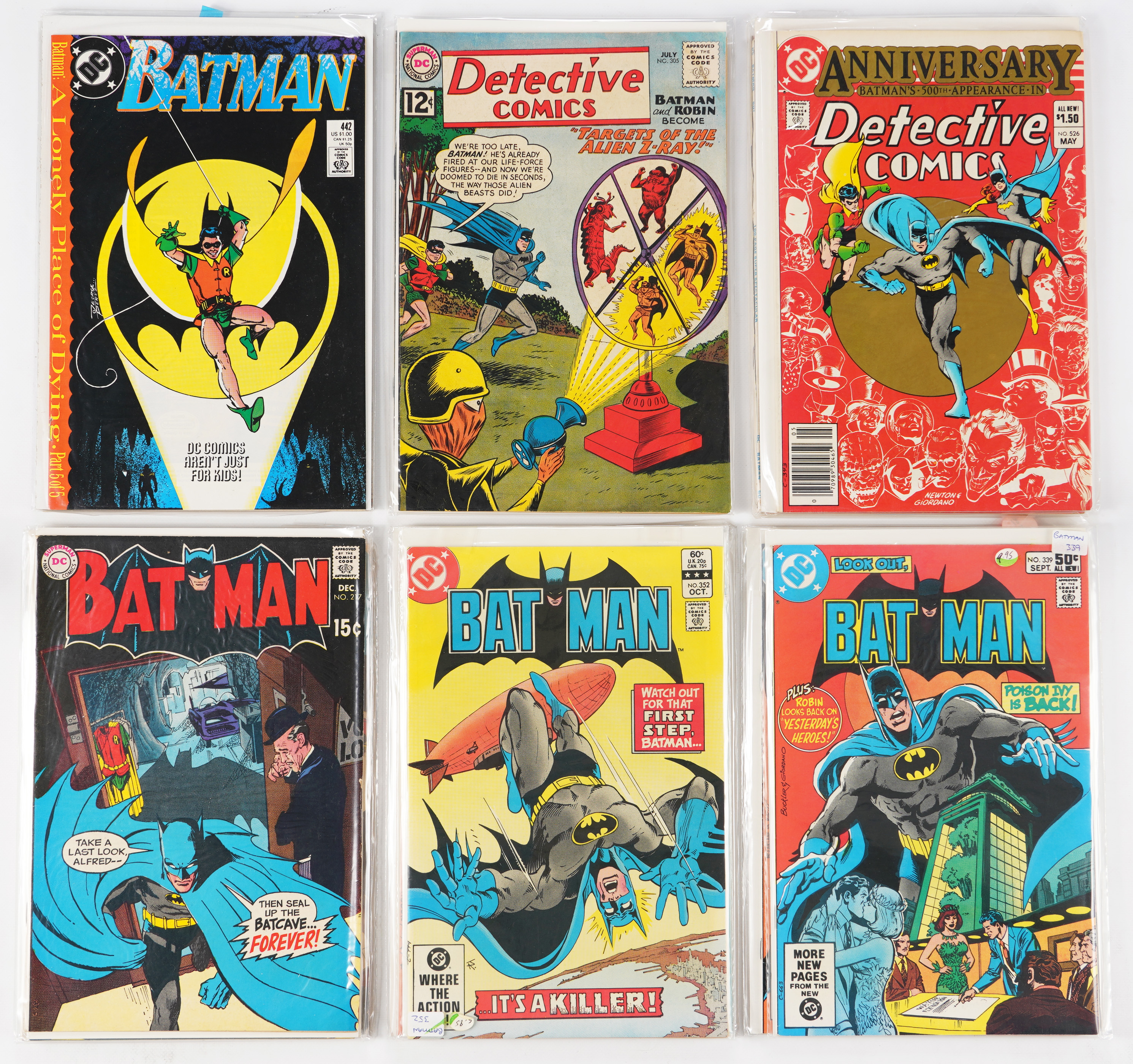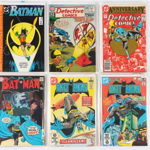 The DC Universe's main attraction swoops in for business, with this 1960s-1980s Batman and Detective Comics collection (60). Split evenly between these two venerable titles, this nicely preserved Bat-bundle reports in a favorable grade range of FN to NM+. Obviously the owner of this collection took great pains in keeping these vintage Silver/Bronze Age comics fresh and attractive, as these books are generally very pleasing, with clean covers and solid spines.