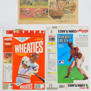 Bob Gibson signed 1992 Kellogg's Corn Flakes cereal box, with a Baseball Greats Gibson cut-out figure on the back panel.
