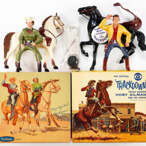 Hoby Gilman “Tackdown” full-size horse and rider set is a stunning factory box, with all flaps intact. Accessories are hat, gun, saddle and strap, reins, instructions sheet, catalog brochure, and a hang tag .