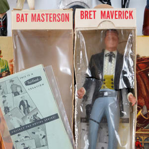 Bret Maverick full-size gunfighter figure in original factory box. The box retains a solid, pleasing shape, though the cellophane on the front is torn open. Accessories are hat, gun, and catalog brochure.