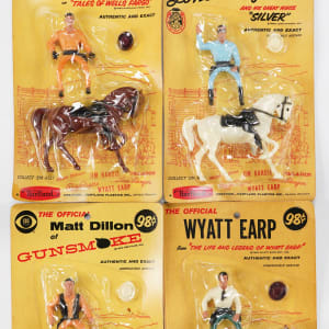 Western 500 Series mini-horse and riders sets (4) in sealed factory packages, with: Lone Ranger, Matt Dillon, Wyatt Earp, and Jim Hardie. The figures and accessories present in pristine state. The package card backers are somewhat curled, but still attractive, with deference to a small piece torn off at the top-right corner of the Lone Ranger package, with the torn off piece present for potential repair.
