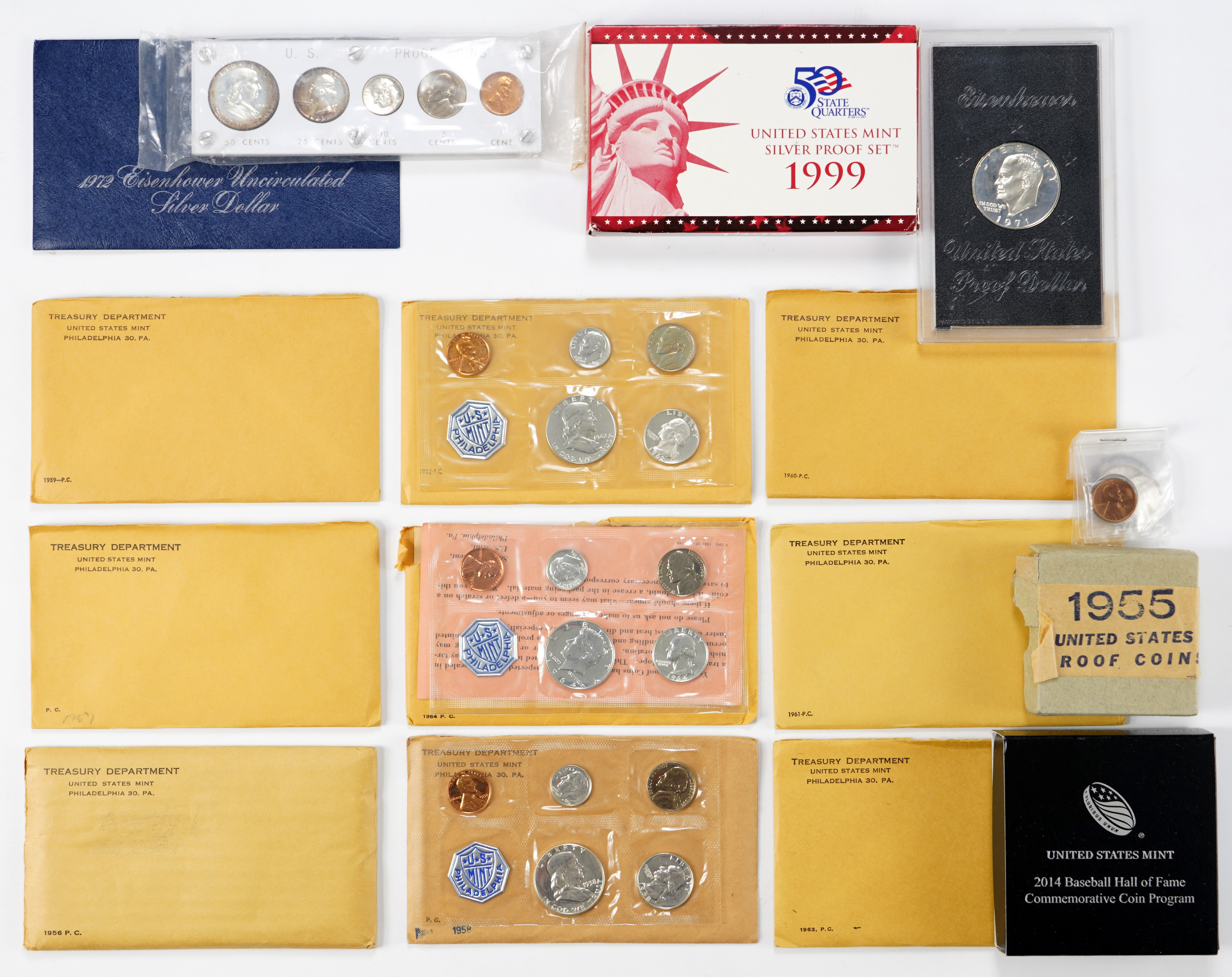 1955 U.S. Mint proof set with three 90% silver coins, with one each: half dollar, quarter, and dime; and one each: nickel, penny.