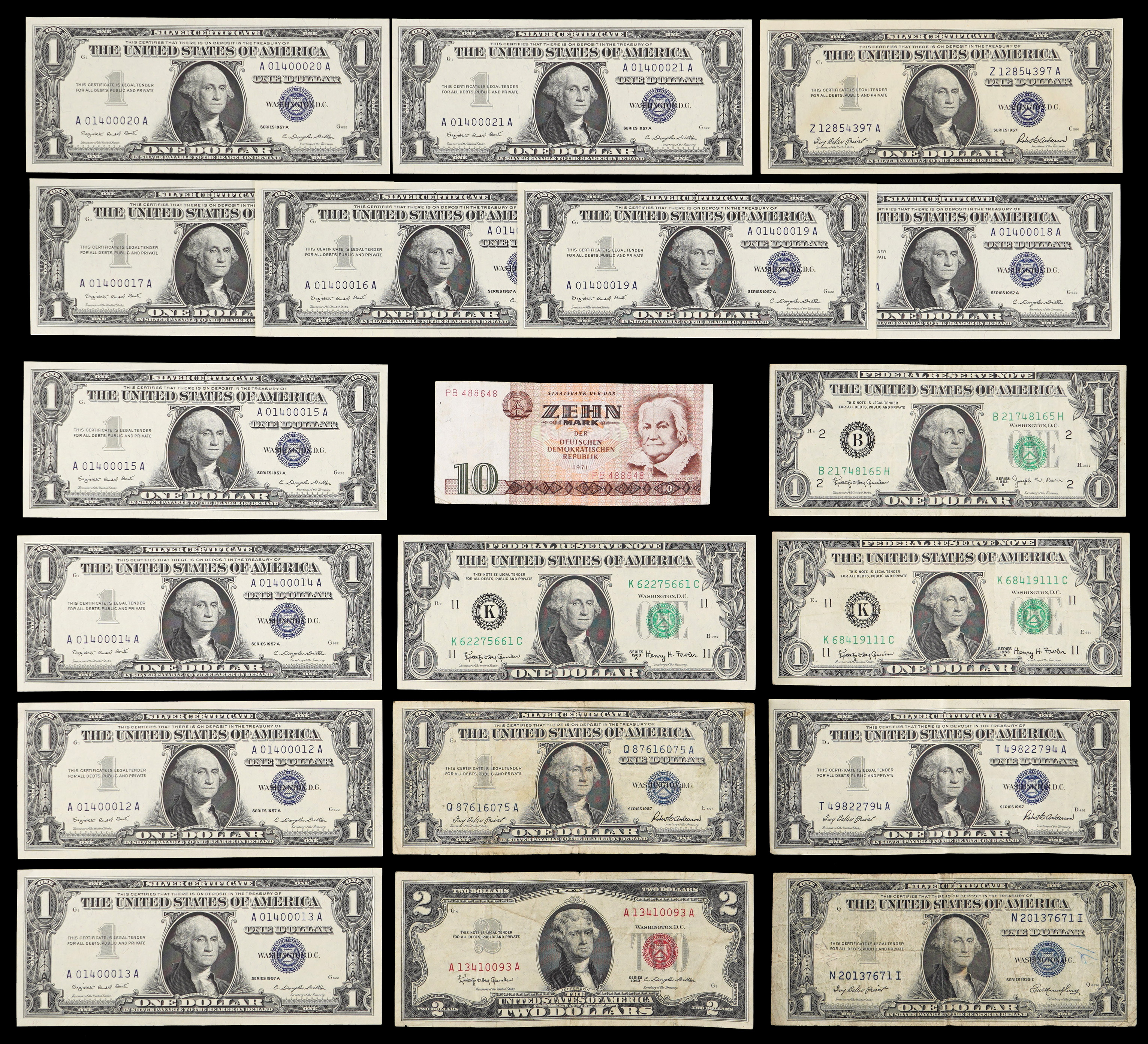 Also present in an uncounted bonus 1971 German Democratic Republic (DDR) 10 Mark note, serial number PB488648 FN+.