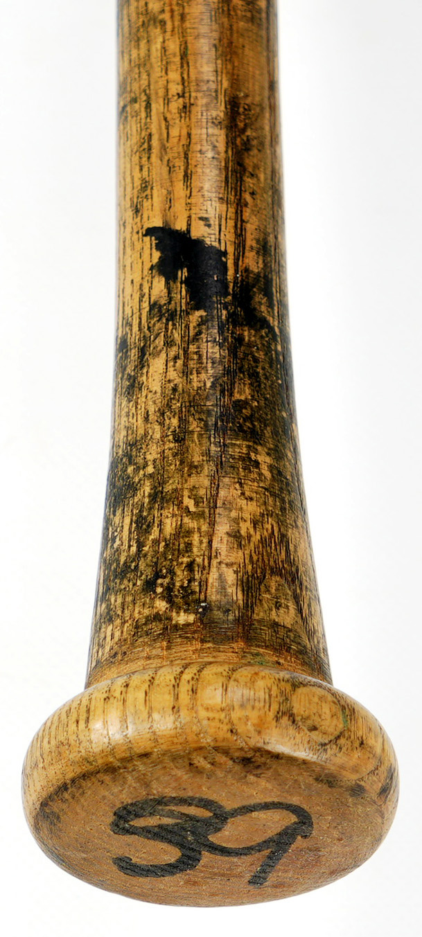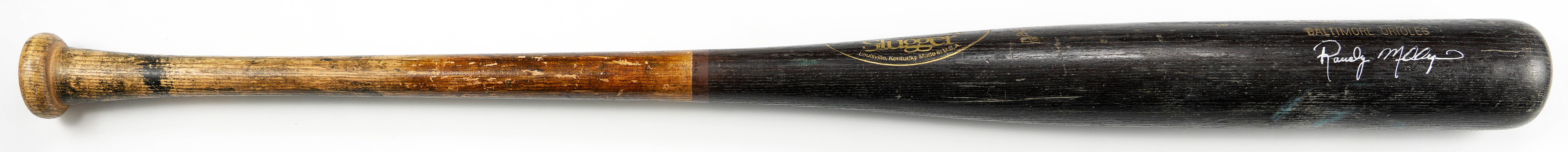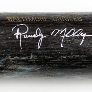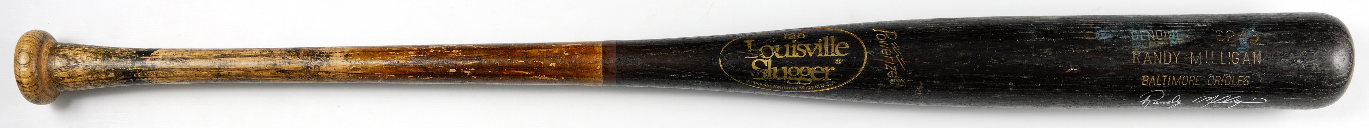 This two-toned Louisville Slugger 125 Randy Milligan Baltimore Orioles model C243 bat shows plenty of game use and pine tar, and has Milligan’s #39 written on the knob in dark marker. Standing out from the black barrel is a very nice (“9”) silver fine-tip sharpie signature by the infielder.