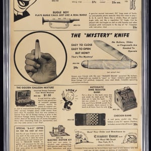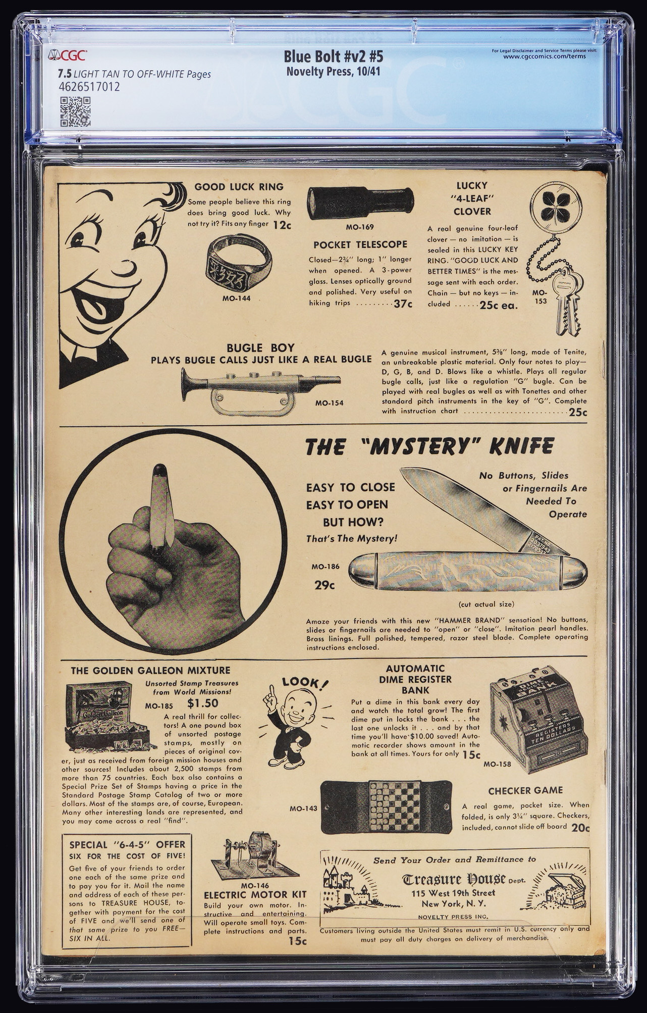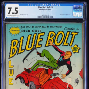 Quality, age and scarcity recommend this 10/41 Novelty Press Blue Bolt Vol.2, #5 issue. So far, CGC has graded just five examples of this early Golden Age comic book. This one has scored a favorable grade of 7.5, Light Tan to Off-White Pages, from top certification service CGC. Besides Blue Bolt and a host of other characters, this anthology title featured the scientifically developed hero Dick Cole, who is seen on the cover wearing his Farr Military Academy sweater, as he is ejected from his car during a bridge explosion set off by Simba Karno. Label notes are "Paul Gustavson art. 1st appearance of Freezum.".