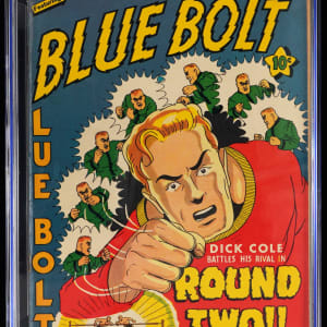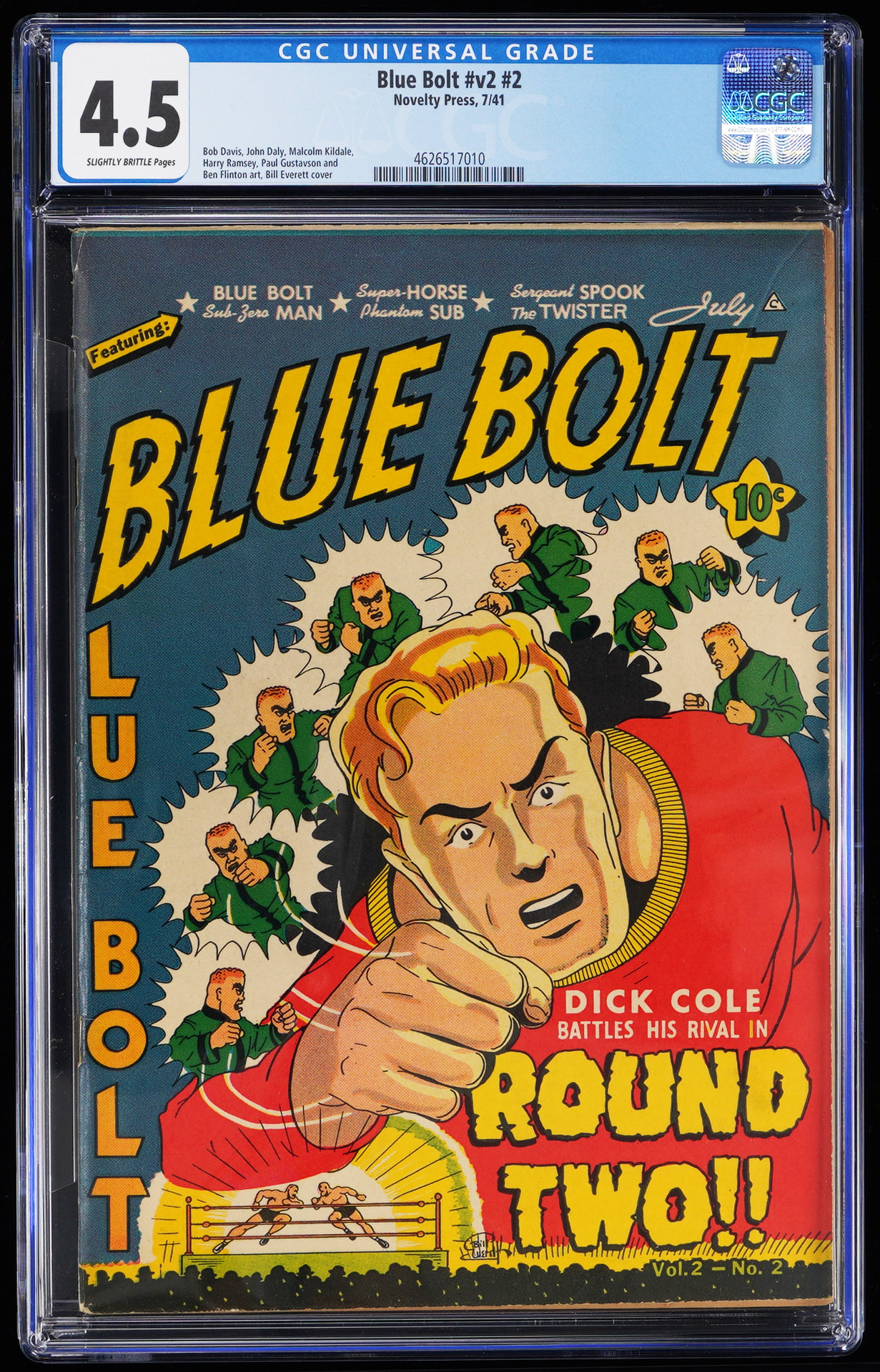 Bag a tough early Golden Age comic book, when you score this 7/41 Novelty Press Blue Bolt Vol.2, #2 issue. Billed as "Round Two", this issue continues the fight between Dick Cole and his rival, that began in the previous Blue Bolt Vol.2, #1 issue, which can also be found in this current auction. It's safe to say this issue is scarce, as CGC has graded only five examples to date. This attractive comic has earned a 4.5, Slightly Brittle Pages grade from CGC. Label notes are "Bob Davis, John Daly, Malcolm Kildale, Harry Ramsey, Paul Gustavson and Ben Flinton art, Bill Everett cover.".