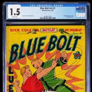 Come out swinging for this 6/41 Novelty Press Blue Bolt Vol.2, #1 issue. Starting off the second season of the Golden Age Blue Bolt run, this exciting comic is fronted by a fierce hand-to-hand battle between Dick Cole and his double. Issues from the later part of the 1940-1949 Blue Bolt run aren't all that hard to find, but issues from the first couple of years are seldom seen. Rated 1.5, Brittle Pages by CGC, this early Blue Bolt comic is one of just five examples of this issue graded by CGC to date. Label notes are "Everett cover, Gustavson art. Origin Dick Cole, Twister and Simba Karno.".