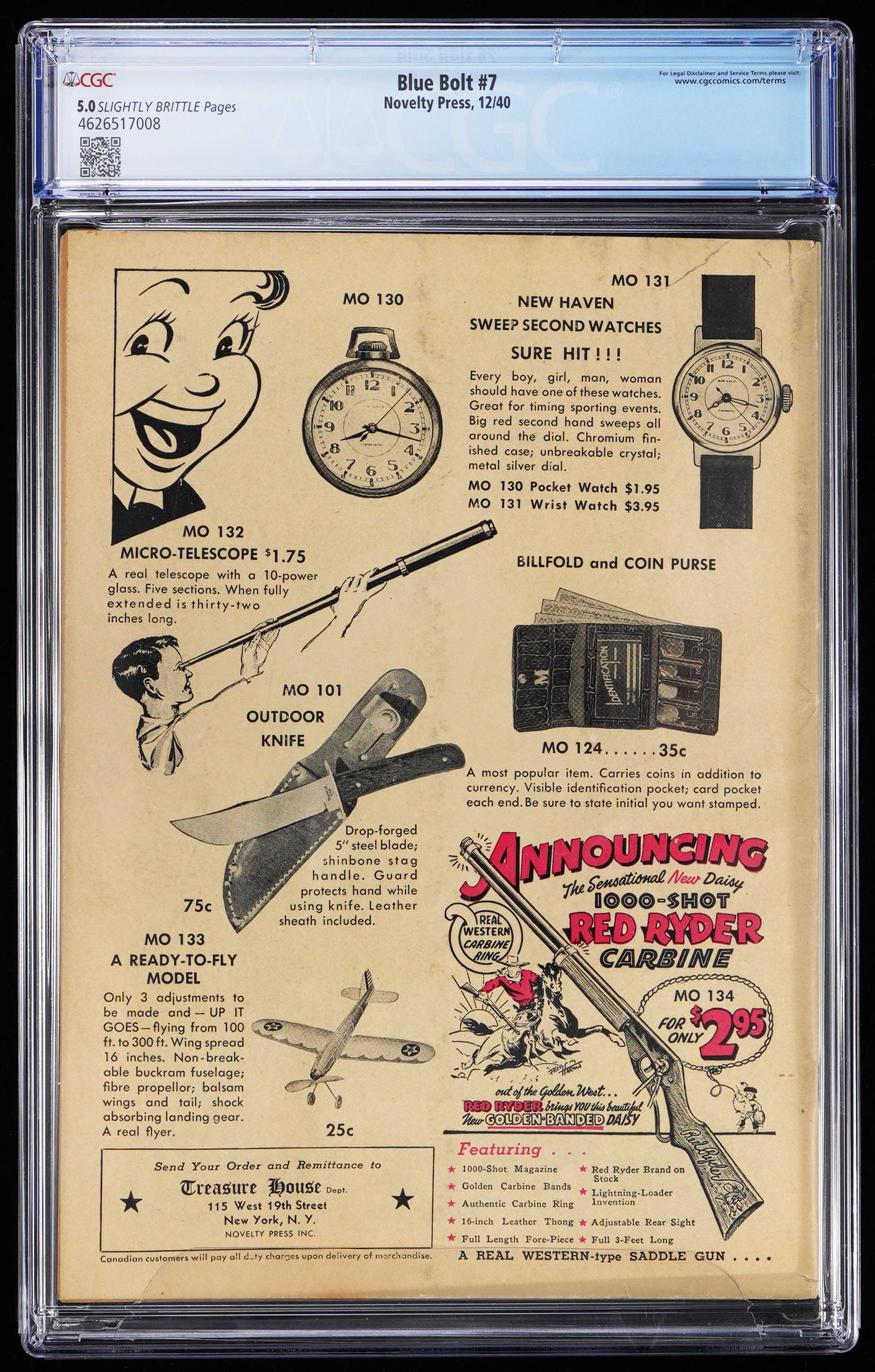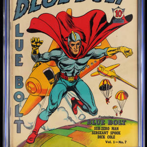 An historic treasure takes the stage, with this 12/40 Novelty Press Blue Bolt #7 issue. With the year 1938 considered the starting point for the Golden Age of Comics, Blue Bolt is one of the earlier costumed hero titles to hit the newsstands. History makers Joe Simon and Jack Kirby played a big part in popularizing the super-hero genre, and this issue dates from the first year of their celebrated collaboration. A dynamic cover from these legendary creators, prompted period readers to include this classic Golden Age comic among their purchases. Eighty-five years later, available examples are in very short supply, as the majority of original owners didn't think to keep them. CGC has favorably approved of this handsome example, providing a grade of 5.0, Slightly Brittle Pages. A check of CGC's Population Report reveals thirteen examples of this pre-war comic have been graded in Universal Grade holders to date. The offered comic stands as "1 of 1" at the 5.0 level, with four rated higher. Label notes are "Joe Simon, Jack Kirby, Malcolm Kildale, Bob Davis, Jack A. Warren and Paul Gustavson stories and art. Joe Simon and Jack Kirby cover.".