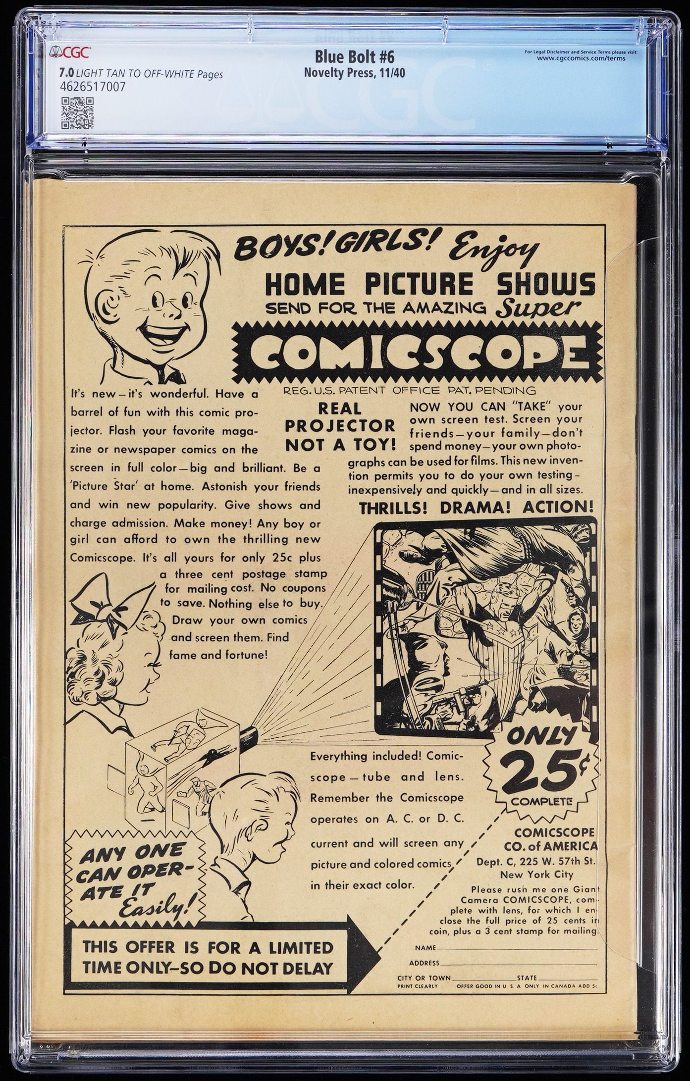 An early effort by super-creator team Joe Simon and Jack Kirby is spotlighted, with this 11/40 Novelty Press Blue Bolt #6 issue. Simon and Kirby teamed-up for work on many classic Golden Age characters and titles, including Blue Bolt, Sandman, Manhunter, Boy Commandos, and most famously, Captain America. This inaugural year Blue Bolt comic predates the release of Captain America Comics #1, and stands as one of the revered team's earliest productions. Attesting to the rarity of this seldom offered issue, CGC has graded just six examples to date. This one is graded CGC 7.0, placing it as "1 of 1" on the Population Report, with two higher. Label notes are "Joe Simon, Jack Kirby, Bob Davis, Jack A. Warren, Henry Kiefer and Malcolm Kildale stories and art.".