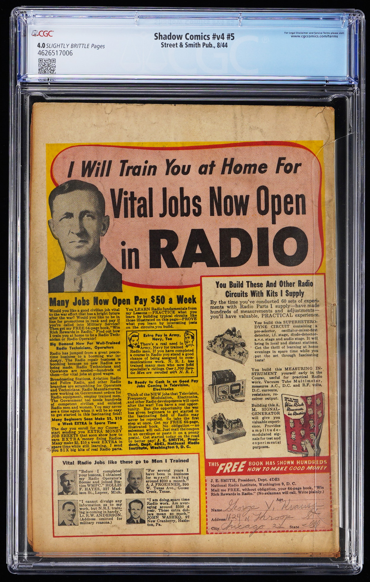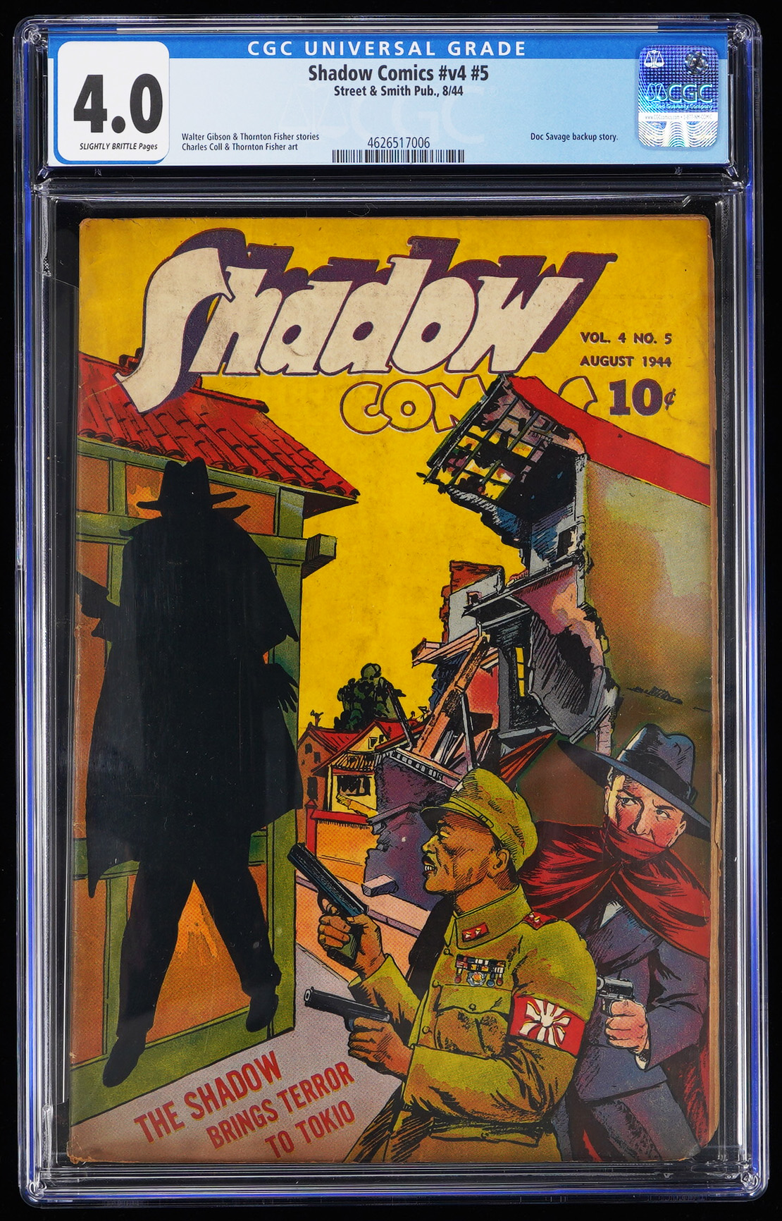 A scarce Golden Age comic book surfaces, with this 8/44 Street & Smith Shadow Comics Vol.4, #5 issue. It's well-documented that many WWII era comic books were sent overseas to the boys battling on the front lines, never to return after being passed around from soldier to soldier, resulting in a short supply of comics published during the war years. This Shadow comic runs true to form, with a total CGC Universal Grade population of eleven. Fresh back from grading submission, this ancient comic has scored a respectable 4.0, Slightly Brittle Pages designation from CGC. The classic front cover sees the Shadow magically deploy his shadow across the street, to divert the attention of Japanese officer he's about to take prisoner. The cover caption sums it up nicely, with "The Shadow Brings Terror To Tokyo". Label notes are "Walter Gibson & Thornton Fisher stories, Charles Coll & Thornton Fisher art. Doc Savage backup story.".