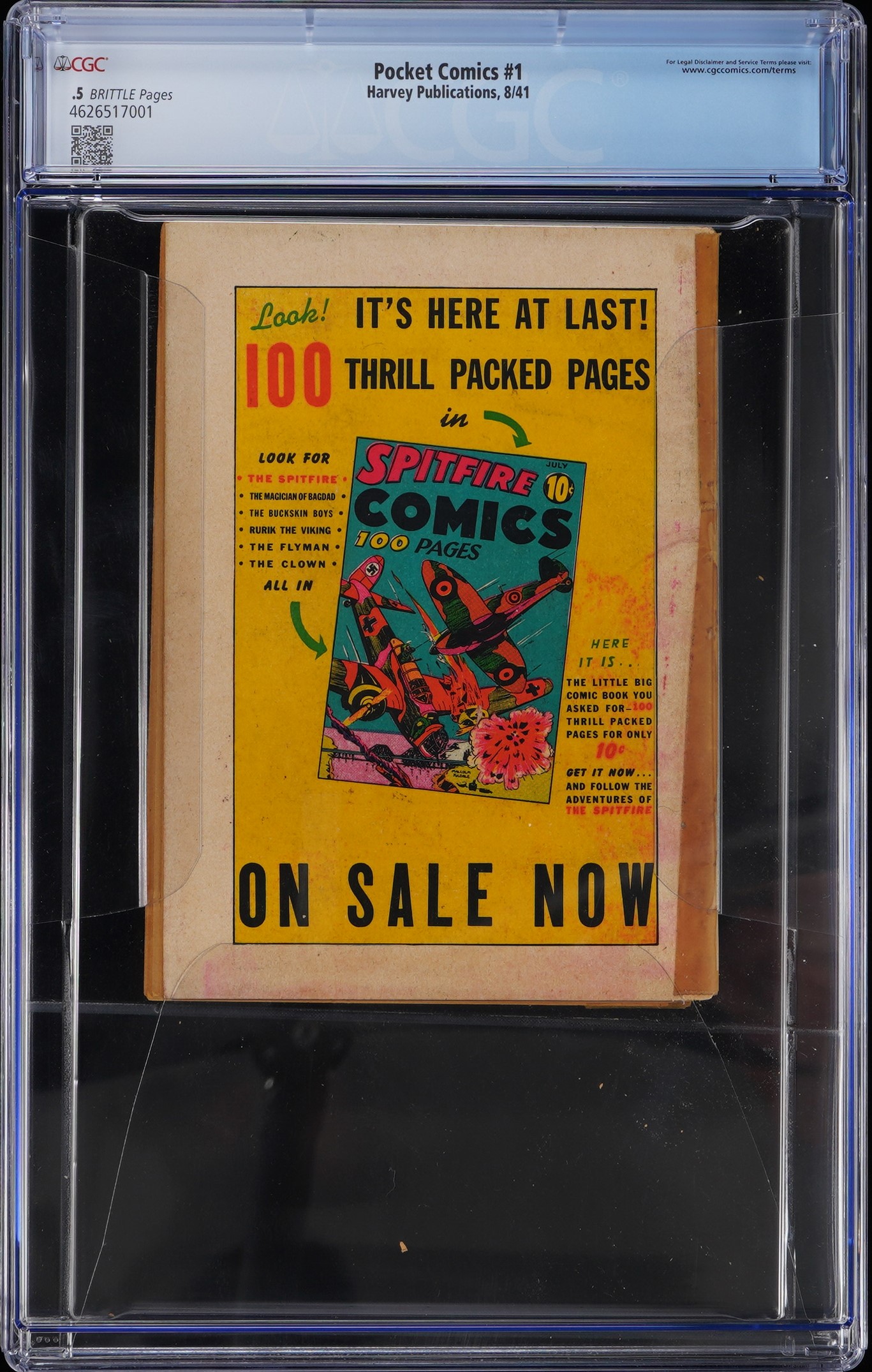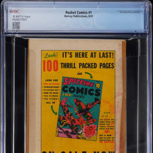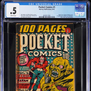 Mark the debut of an alluring Golden Age super-hero, with this 8/41 Harvey Publications Pocket Comics #1 issue. This digest-sized comic book was an early venture into the super-hero genre for Harvey, which is best known for its humor characters. The treasured hero making her first appearance in this scarce comic, is Black Cat/Linda Turner. Ranked #41 on the Comic Buyer's Guide's "100 Sexiest Women in Comics" list, the Black Cat battled evil in a revealing costume that lit up the 1940s. The list of masterminds behind this WWII era pre-code comic, include legendary creators Otto Binder and Joe Simon. Though a full spine tape repair gave CGC cause to rate this inaugural issue of Pocket Comics .5, the rarity of this super-tough comic more than makes up for the low score. Label notes are "Otto Binder and Alfred Harvey stories, Pierce Rice, Barbara Hall, Al Avison art, Joe Simon cover and art. Digest size. Statue of Liberty cover. 1st appearance of Black Cat, Red Blazer, Shinx, Zebra and Cadet Blakey.".