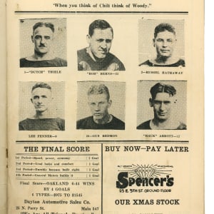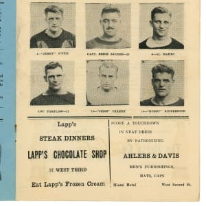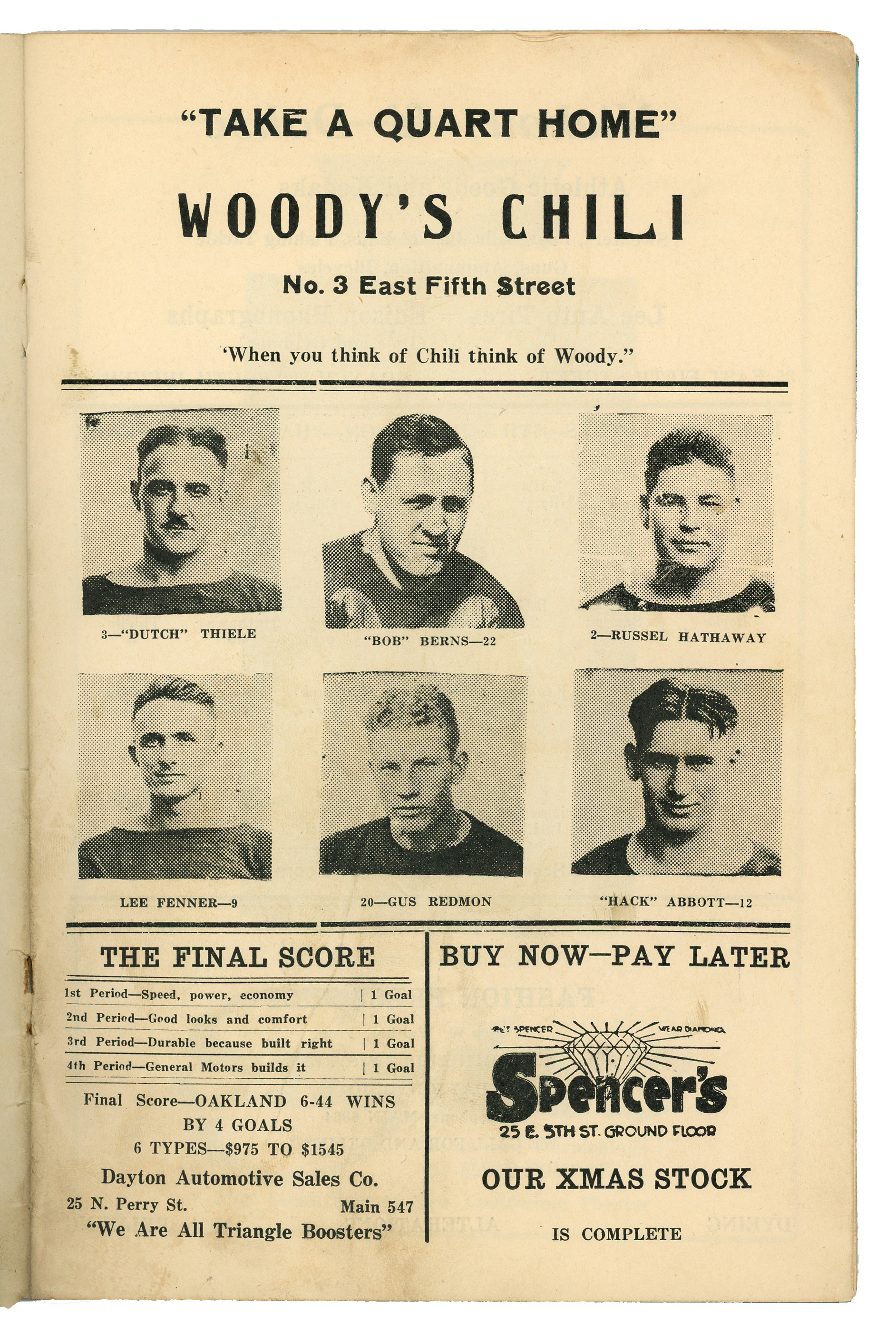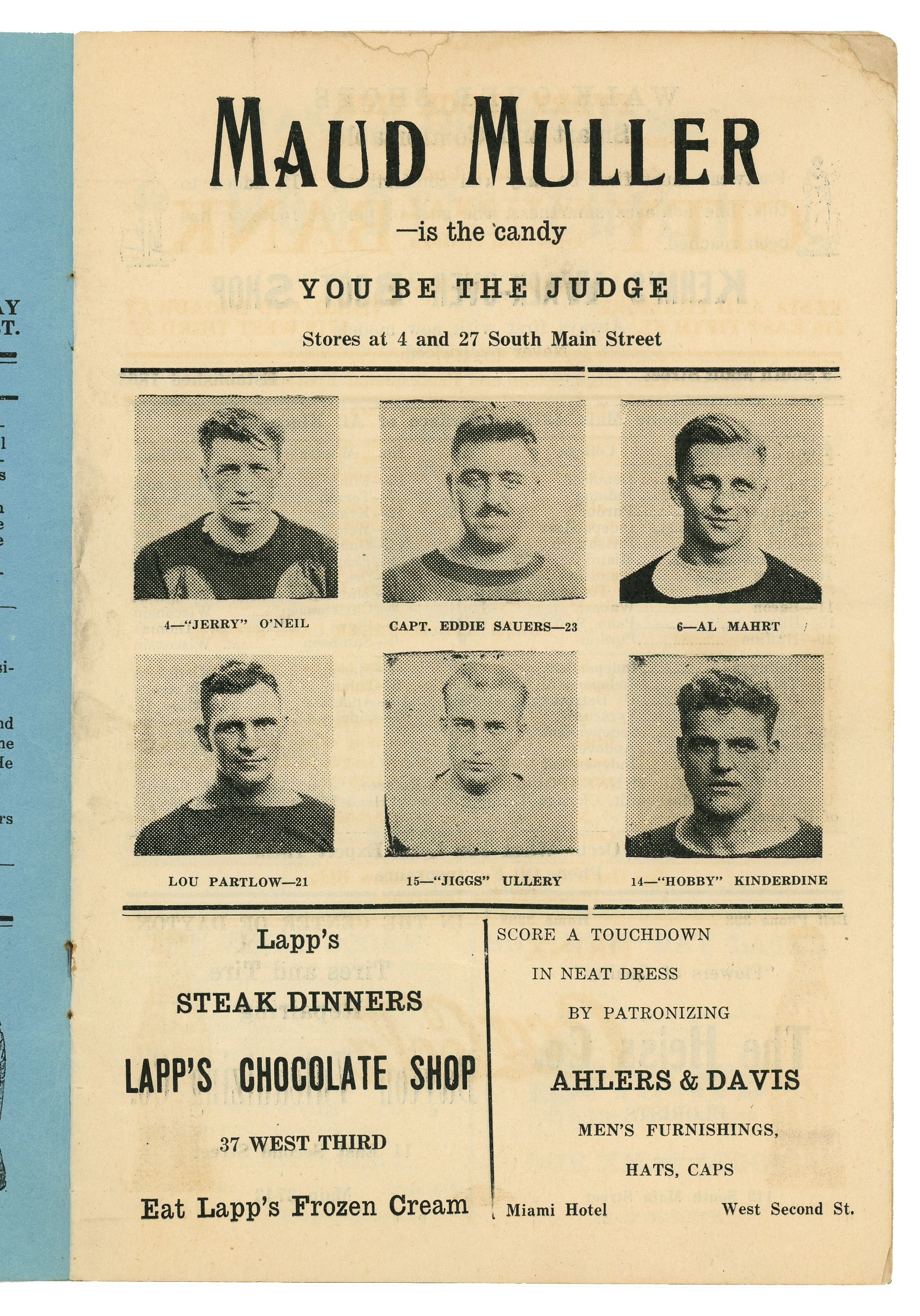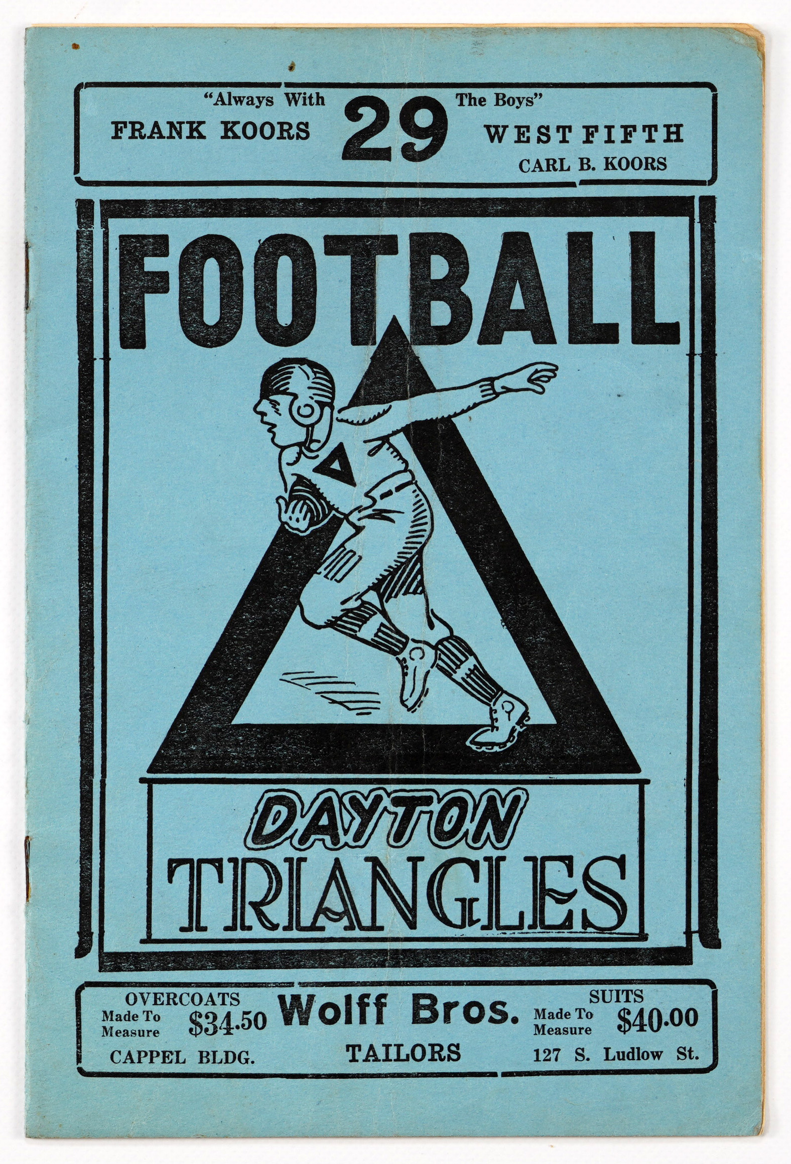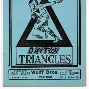 Though folded vertically down the center, this hardy survivor otherwise presents handsomely, with a crisp, clean cover, displaying bold graphics. The pages are clean and supple, and the scoring grid is unused. Pictured throughout, are the Triangles players, in photographs interspersed among an array of advertising for local Dayton businesses. Some of the more important Dayton stars noted, are team captain Eddie Sauer, Al Mahrt, "Hobby" Kenderdine, and Lou Partlow, who is cited as scoring the first official touchdown in NFL history, on October 3rd, 1920, against the Columbus Panhandles.