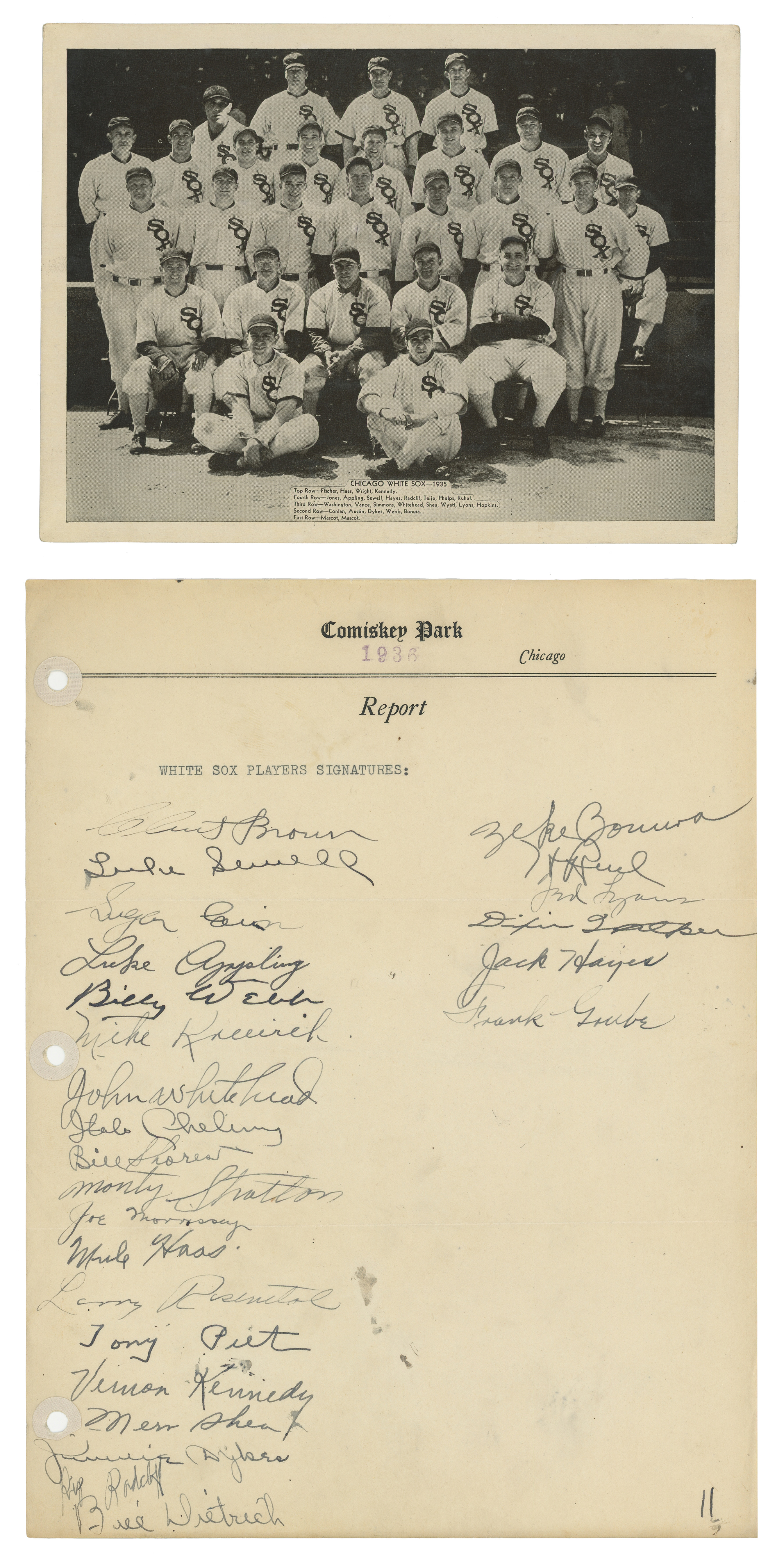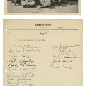 Though the White Sox were a "second division" team throughout much of the 1930s-1940s, a 1936 team-signed sheet should generate plenty of interest, as the subjects passed away anywhere from thirty to eighty years ago. Plenty of tough signatures are noted, and the more prominent signers are a couple of Hall of Famers and several high-profile stars, along with Monty Stratton, who lost his leg in a 1938 hunting accident, but came back to play minor league ball from 1946-1953, wearing a prosthetic leg. (25) Generally distinct signatures appear on a sheet of Comiskey Park letterhead, stamp-dated "1936", with: Clint Brown (d.1955), Luke Sewell (d.1987), "Sugar" Cain (d.1975), Luke Appling (HOF, d.1991), Bill Webb (coach, d.1943), Mike Kreevich (d.1994), John Whitehead (d.1964), Italo Chelini (d.1972), Bill Shores (d.1984), Monty Stratton (d.1982), Jo-Jo Morrissey (d.1950), "Mule"Haas (d.1974), Larry Rosenthal (d.1992), Tony Piet (d.1981), Vernon Kennedy (d.1993), Merv Shea (d.1953), Jimmie Dykes (manager, clubhouse signature), "Rip" Radcliff (clubhouse signature), Bill Dietrich (clubhouse), "Zeke" Bonura (d.1987), "Muddy" Ruel (coach, d.1963), Ted Lyons (HOF, d.1986), "Dixie" Walker (d.1982), Jack Hayes (d.1983). Frank Grube (d.1943).