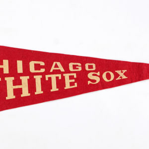 Strong support for your attention is also derived from a rare 1940s 3/4-size pennant VG-EX. This vintage felt flag is decorated with an appliqué featuring a pair of socks over a baseball and crossed bats. Vintage White Sox pennants with a single sock turn up regularly, but you'll have a hard time trying locate another example with two socks.