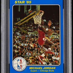 Graded EX 5 by PSA. Dynamic 1984-1985 Star Basketball Court Kings 5x7 #26 Michael Jordan jumbo portraying "His Airness" soaring through the stratosphere. With exception to limited corner wear, this Chicago Bulls Hall of Fame legend otherwise presents higher grade. Limited to an estimated 5,000 copies.