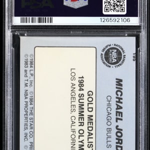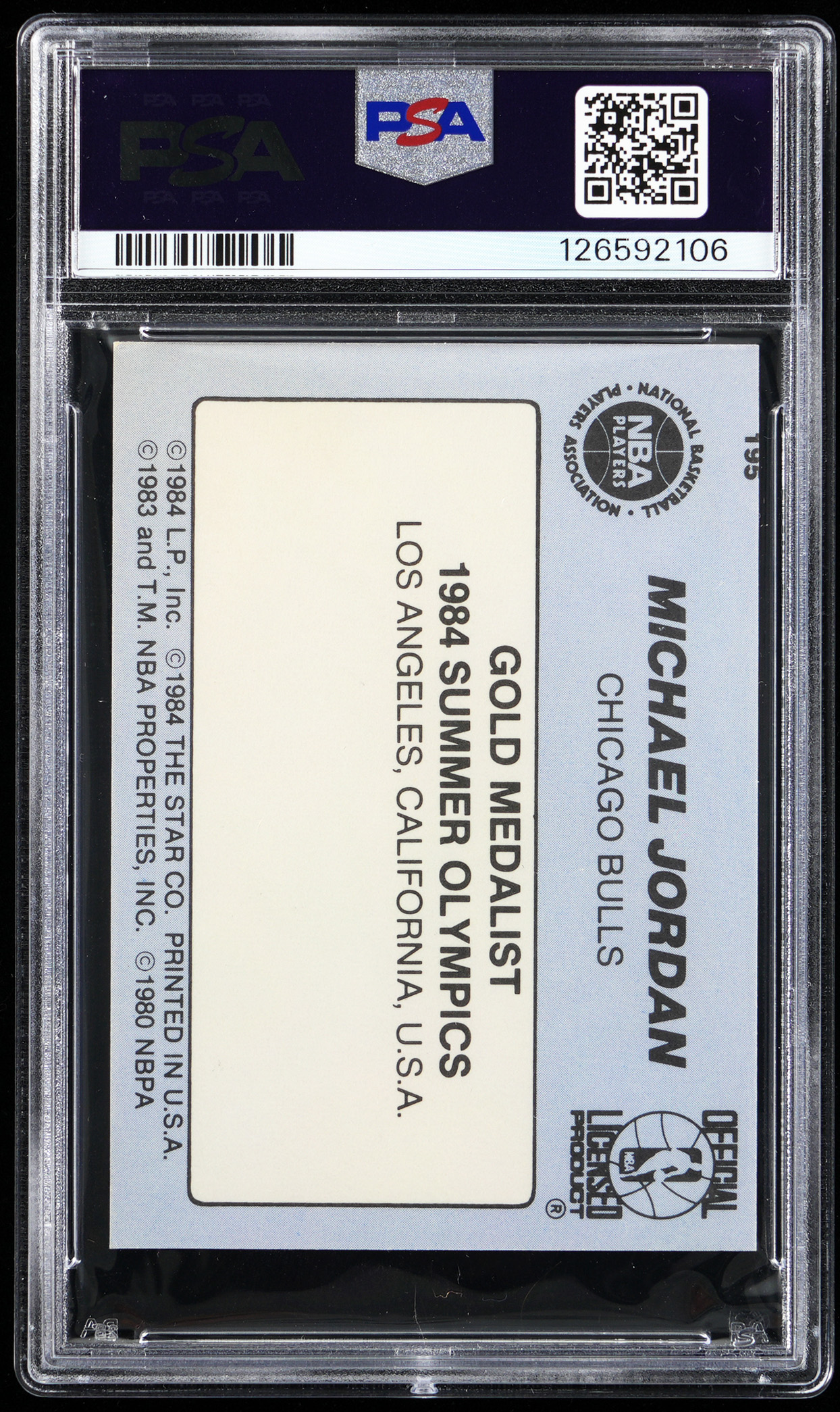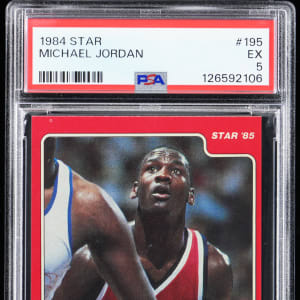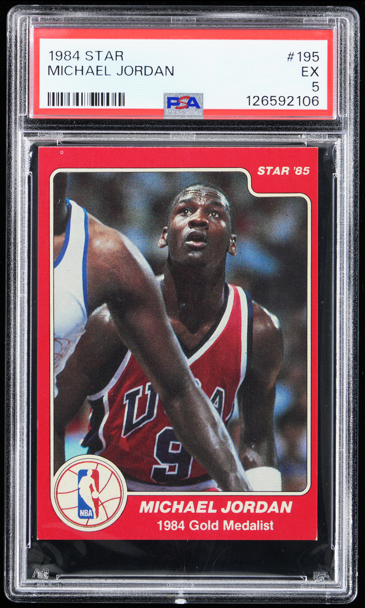 Graded EX 5 by PSA. Earn your collecting gold medal with the offered 1984-1985 Star Basketball #195 Michael Jordan rookie card. This important debut of the Olympic champion pictures the future Chicago Bulls Hall of Fame immortal getting ready to box out a free throw. A seldom offered example that pre-dates the mainstream 1986-1987 Fleer Basketball blockbuster by a full two seasons!
