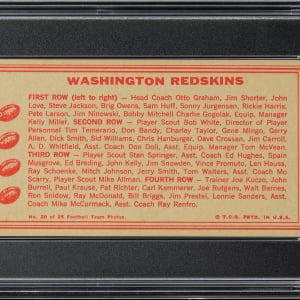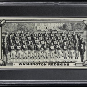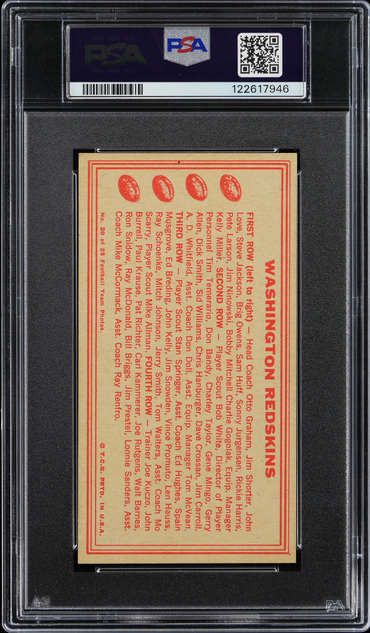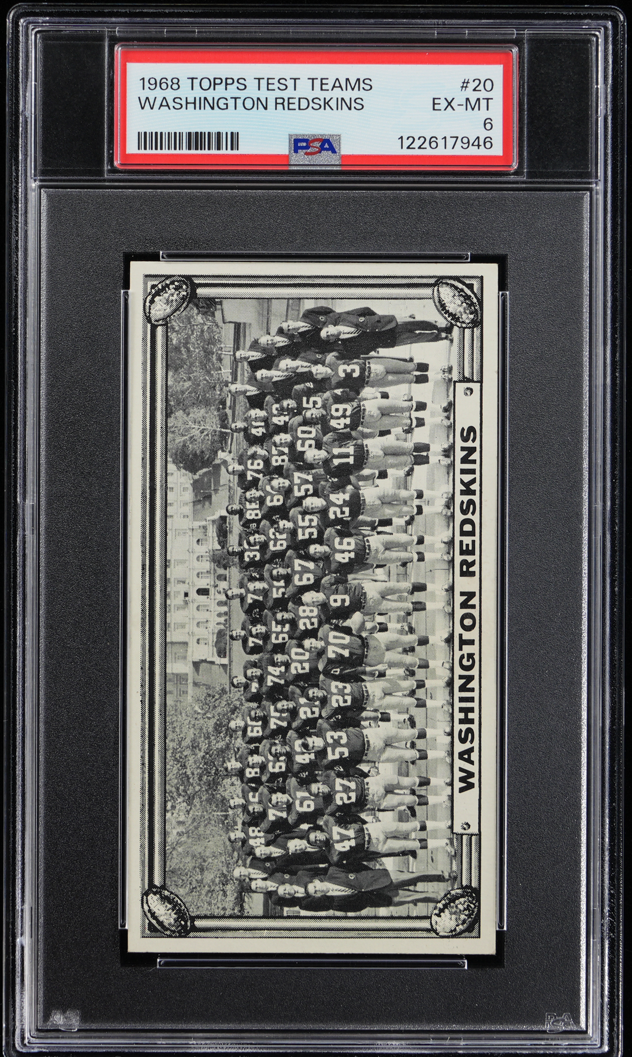 Graded EX-MT 6 by PSA. Tough 1968 Topps Test Teams #20 Washington Redskins example. Only 37 total copies of this team picture have been judged by the authenticator.