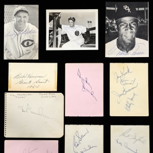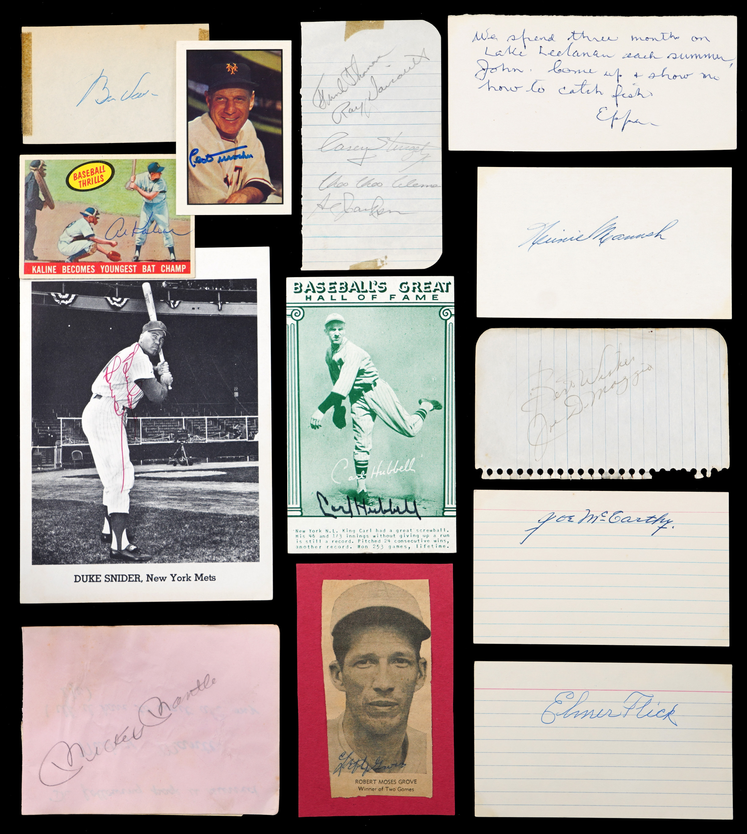 Album Pages/Cuts/Index Cards (19) with (59) total signatures including (12+) HOF with Mickey Mantle, Joe DiMaggio, Luis Aparicio, Heinie Manush, Casey Stengel, Bill Veeck, Joe McCarthy, Elmer Flick.